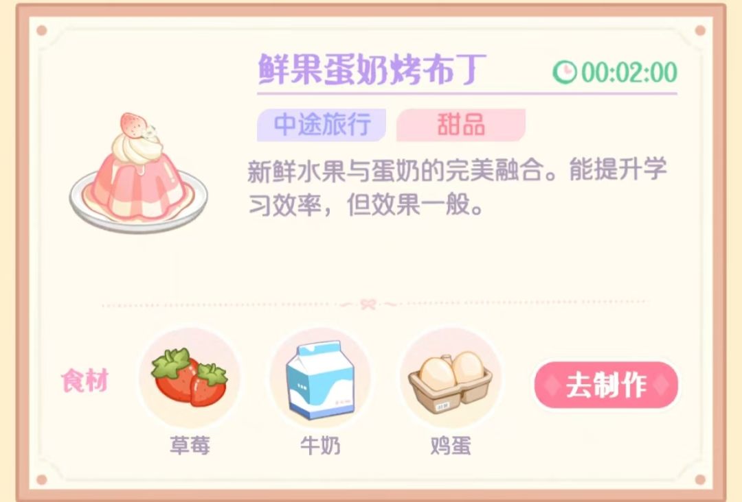 家有急事,不会更新了 菜谱制作过程中概率掉落奶油,肉馅等食材 图2转自花花与幕间剧官1群的热心主理夏日微凉, 8秒 面粉+面粉=面饼 20分钟 米+米=米饼 肉+肉=烤肉 鱼+鱼=烤鱼 蛋+蛋=水煮蛋 水果+水果=果汁 牛奶+牛奶=奶酪 白菜+白菜=沙拉 鸡肉+鸡肉=烤鸡腿 坚果+坚果=坚果糊 1小时 面粉+蛋=面包 蛋+牛奶=布丁 米+坚果=汤圆 鸡肉+肉=肚包鸡 米+