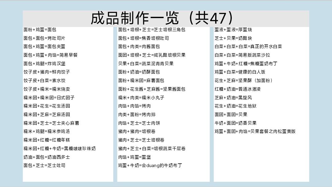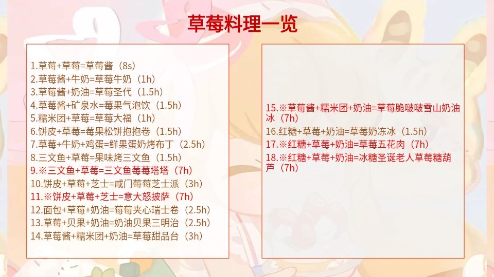 看到了就加,主要是整理成一图方便玩家查漏补缺。 隐藏均跟在同做法的菜谱后面,请注意。 【红糖+草莓+奶油】这个菜谱有两个随机的隐藏,并非错误记录。