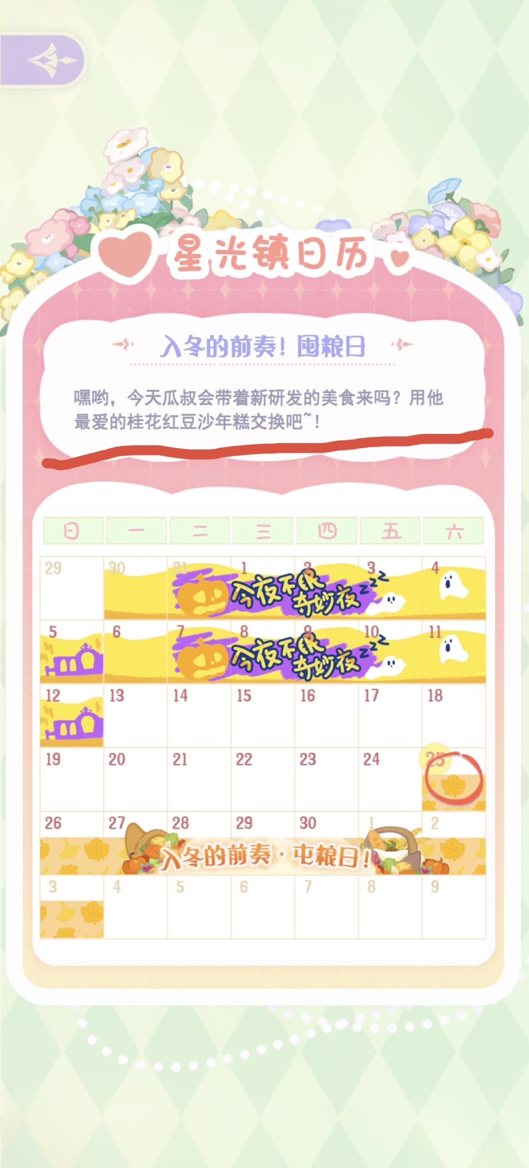 囤货日活动,注意一下星光镇日历!