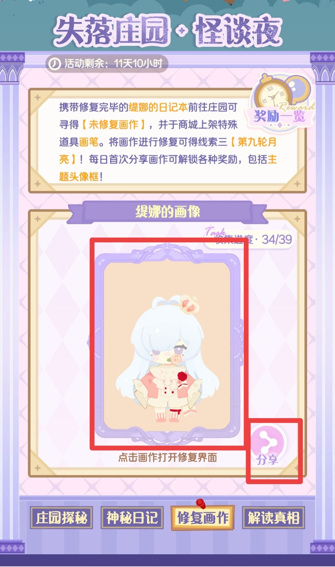 本次活动带『缇娜的日记本』出现回来后 获得『未修复的画作』 ⚠️这里可以点击画作直接修复且分享的 注意要把画作的全部模块都进行修复 解锁的出行道具『画笔』个人不建议缺金币的主理购买 因为带回来的修复画作的道具 只可以活动内使用 活动结束后直接消失 #花花与幕间剧攻略 #花花与幕间剧 #花花与幕间剧失落庄园 #罗密欧与朱丽叶演出季 #失落庄园怪诞夜