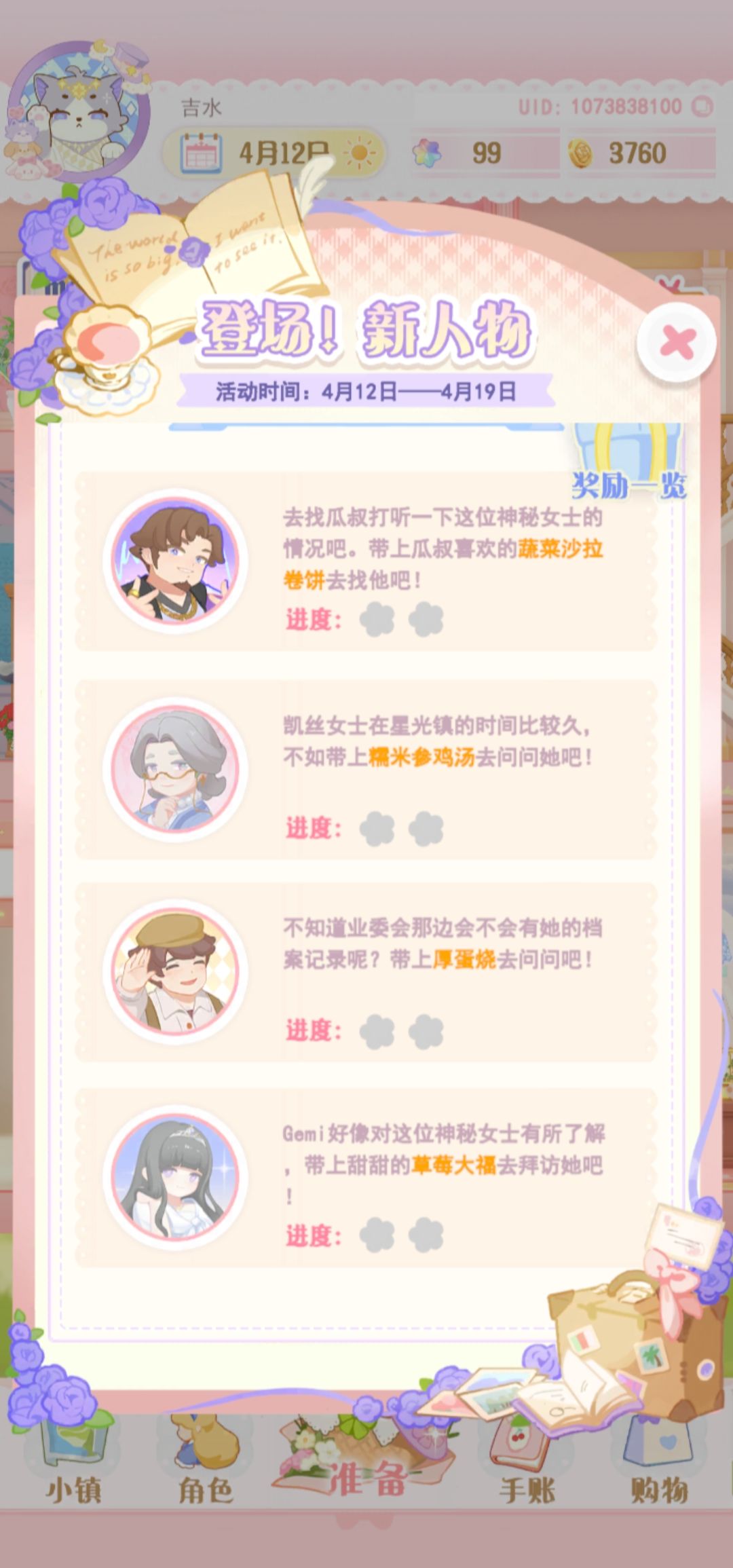 如题,刚发现星光镇日历上会提示当天的来访人喜欢什么食物,至于送了之后会拿到什么还不清楚,明天十二点再看看! 可以拿到食物和五点星光哈。 再加上每个头像需要出行2次,我掐指一算,这次活动需要的食物挺多的,大家多存点金币哈,不然感觉容易拿不满奖励QAQ 只有p需要每个两次,其他只用一次,看错了! —— 添加进日历方法