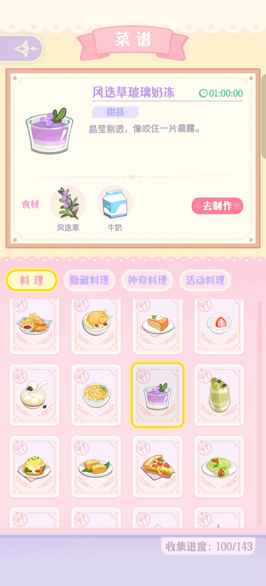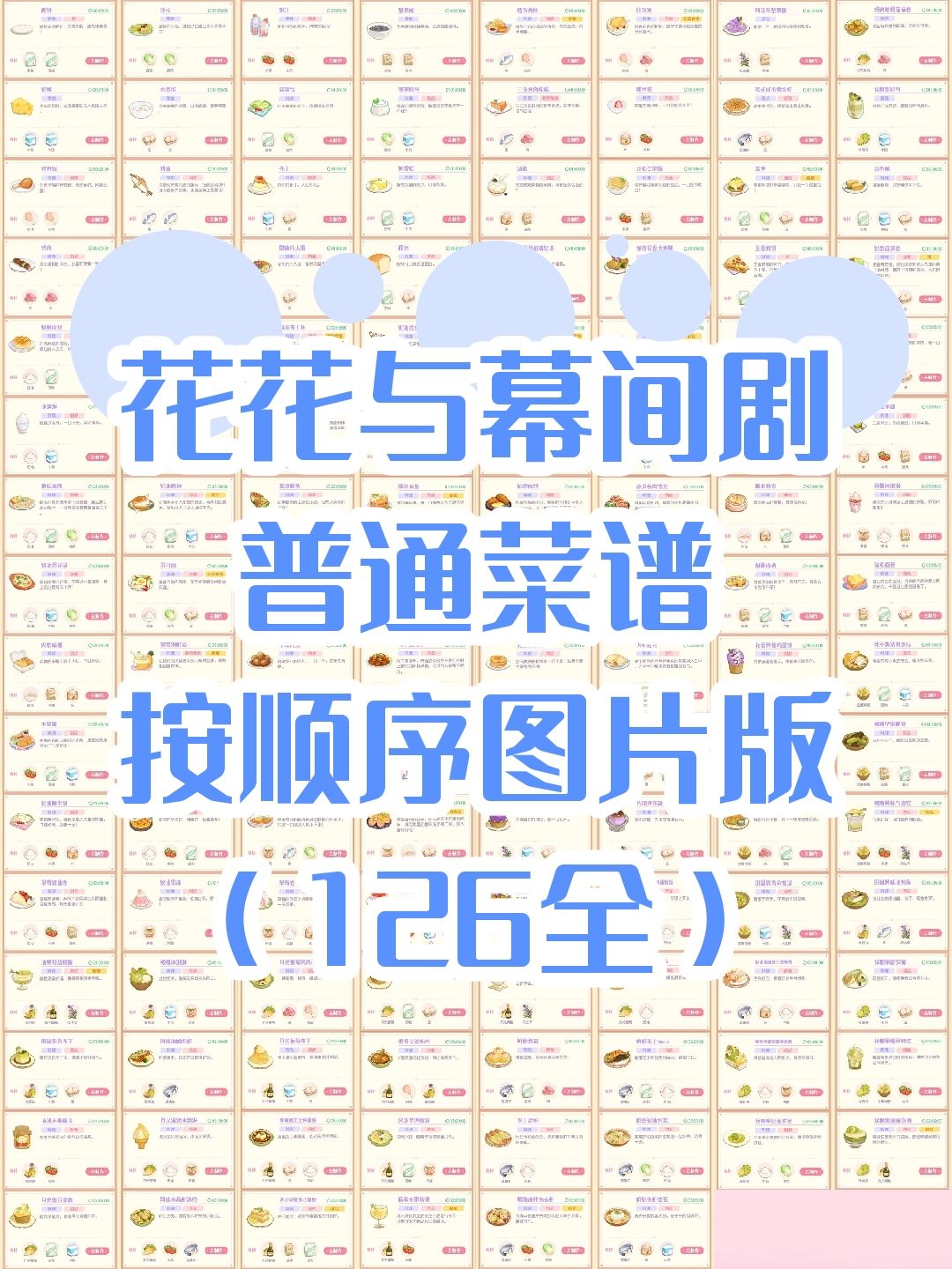 -------------------------------------- 统计:常规菜谱(76/76) 常规菜谱更新(49/49) 隐藏菜谱(15) 隐藏菜谱更新(16/18) 活动菜谱(11) 📌图片版在最后 -------------------------------------- ⏰1小时(图鉴顺序) 风迭草+牛奶=风迭草玻璃奶冻 风迭草+鸡肉=怪奇花香大鸡腿 风迭草+坚果=风