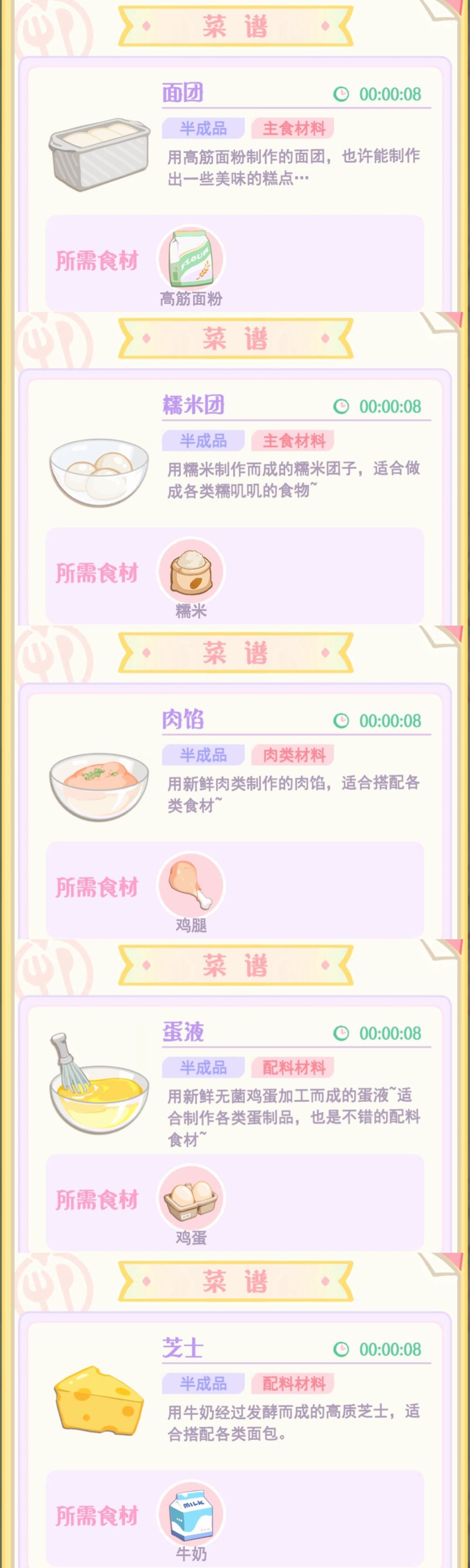 家有急事,不会更新了 菜谱制作过程中概率掉落奶油,肉馅等食材 图2转自花花与幕间剧官1群的热心主理夏日微凉, 8秒 面粉+面粉=面饼 20分钟 米+米=米饼 肉+肉=烤肉 鱼+鱼=烤鱼 蛋+蛋=水煮蛋 水果+水果=果汁 牛奶+牛奶=奶酪 白菜+白菜=沙拉 鸡肉+鸡肉=烤鸡腿 坚果+坚果=坚果糊 1小时 面粉+蛋=面包 蛋+牛奶=布丁 米+坚果=汤圆 鸡肉+肉=肚包鸡 米+