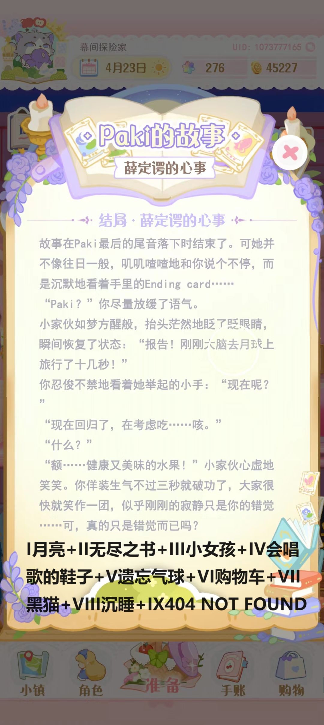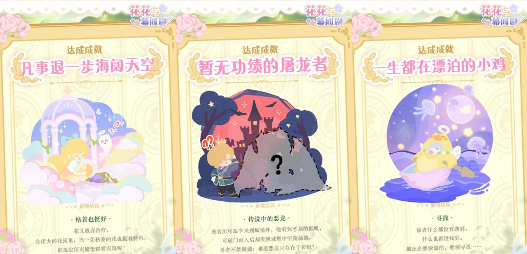 paki爱心(勇气,智慧同理) pea总勇气(爱心,智慧同理) u宝智慧(爱心,勇气同理) 这个关键徽章的值是四个,少于四个结局就不太好(枯萎),大于等于四个就是比较好的(鸡汤) 试了很多次,少于四个就是“枯着也挺好”“传说中的恶龙”“寻找” 大于等于四个就是(按爱心勇气智慧) paki“鸡汤来咯”“破釜沉舟”“我想开了” pea总“我有一个恶龙朋友”“勇者斗恶龙”“空手套恶龙” u宝“新的朋友”