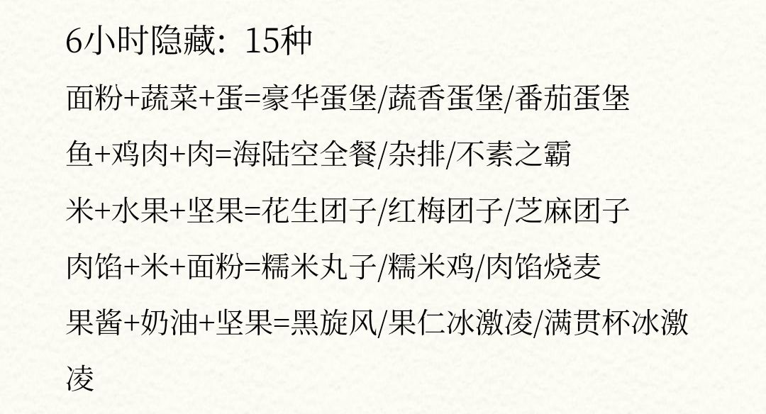 8s: 面粉+面粉=面饼 20分钟: 鱼+鱼=烤鱼 米+米=米饼 肉+肉=烤肉 蛋+蛋=水煮蛋 水果+水果=果汁 牛奶+牛奶=奶酪 蔬菜+蔬菜=沙拉 坚果+坚果=坚果糊 鸡肉+鸡肉=烤鸡腿 1小时: 蛋+牛奶=布丁 米+坚果=汤圆 面粉+蛋=面包 米+水果=糯米滋 鸡肉+肉=肚包鸡 面粉+蔬菜=蔬菜饺 面粉+牛奶=奶香糕 鱼+鸡肉=鳕鱼鸡排 牛奶+蔬菜=薄荷奶昔#花花与幕间剧