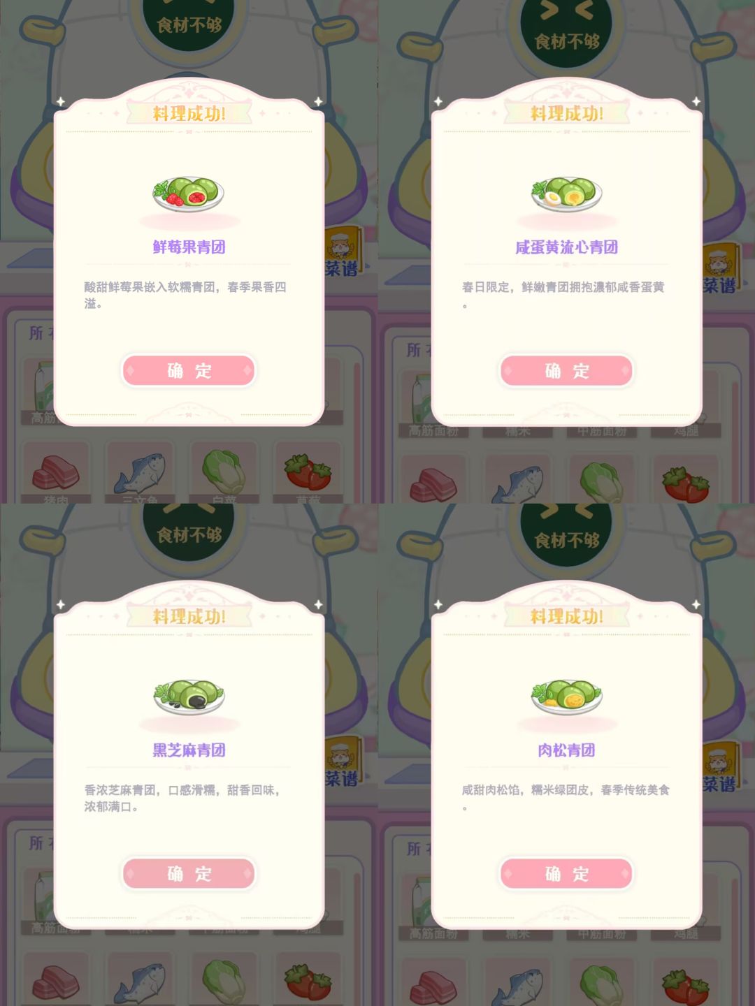 1h 蛋黄酥:鸡蛋+芝麻+中筋面粉 1.5h 棒棒糖:红糖*3 雪花酥:草莓+牛奶+高筋面粉 芙蓉肉:猪肉+鸡蛋+高筋面粉 梅菜扣肉:白菜+猪肉 京酱肉丝:猪肉+白菜+饼皮 枫糖松饼:红糖+烤饼 狗不理包子:面团+猪肉(概率肉酱面包) 土耳其软糖:红糖+草莓酱+中筋面粉 2.5h 驴打滚:花生+糯米团+红糖 四果汤:矿泉水+草莓+糯米团 落水包:糯米团+白菜+猪肉 锅包肉:红糖+猪肉+高筋面粉 梅