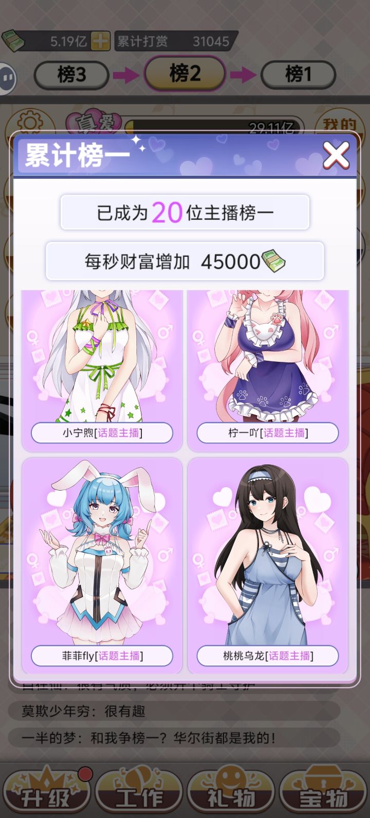 游戏还不赖,就是模拟给主播打赏,通过升级可以加强获得钱的速度的打赏力度。不过看广告才能解锁的宝箱总是在屏幕上飞来飞去有点影响游戏体验