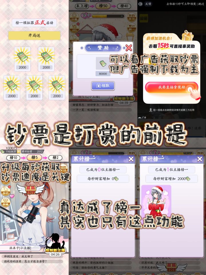 4.即便你是榜一了,你也不会得到主播的感谢或者剧情、观众的惊呼、或者房管安排什么的,这只是纯数值广告游戏,拿到榜一是额外给你货币收益。