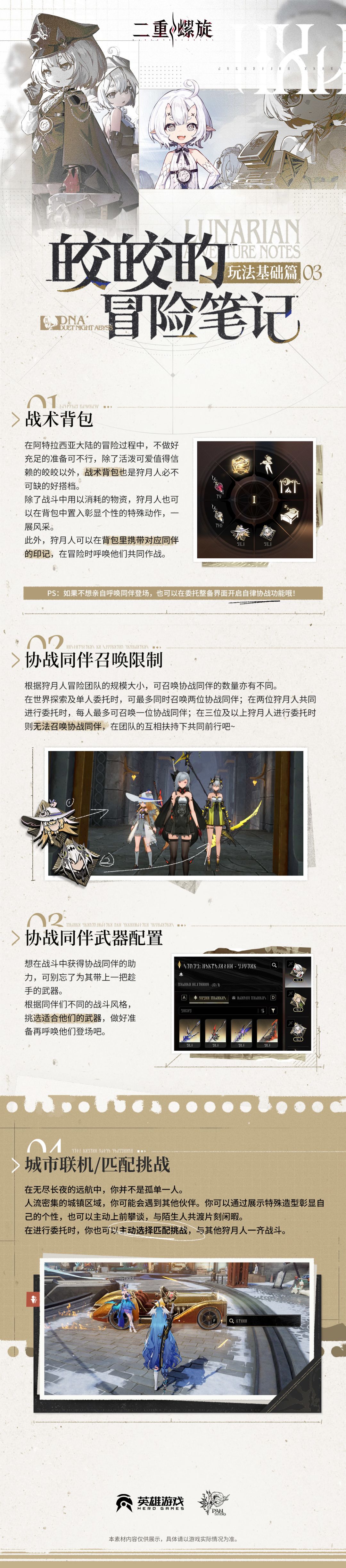 狩月人,经历了两天的特训,想必你已经摩拳擦掌,迫不及待要踏上一段全新的征途了吧,别急,在出发前,先做一下战前准备吧! 《皎皎的冒险笔记:玩法基础篇03》为您献上,本篇内容主要记载了关于阿特拉西亚大陆冒险旅途的须知及战前准备,敬请查阅~ ———————— ✦锁定【10月25日19点】公测前瞻直播,角色武器免费非肝即氪?官方直播打假团来了! ✦参与《攀登!螺旋飞跃!》H5活动,赢取纯白沙漏和魔灵:ht