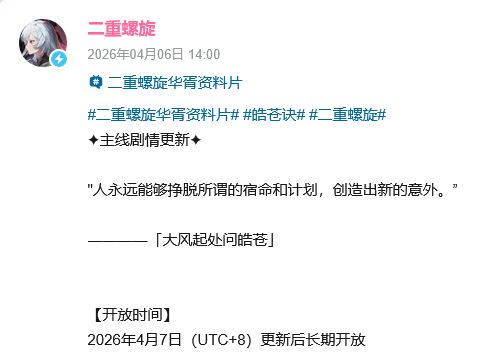 🔥 《二重螺旋》华胥资料片皓苍诀明日上线,主线剧情总算更新,走向引发玩家热议 由英雄游戏旗下潘神工作室自主研发的高自由度幻想冒险RPG《二重螺旋》近日有新信息传来。游戏华胥资料片终章皓苍诀版本将于4月7日正式开启,届时将开放全新场景,新角色也将同步登场 官方此前在版本PV中表示“定数之外,人心自成一线天机”,暗示剧情将走向高潮 此前因主线迟迟未推进,不少玩家曾多次催促官方加快主线剧情更新节