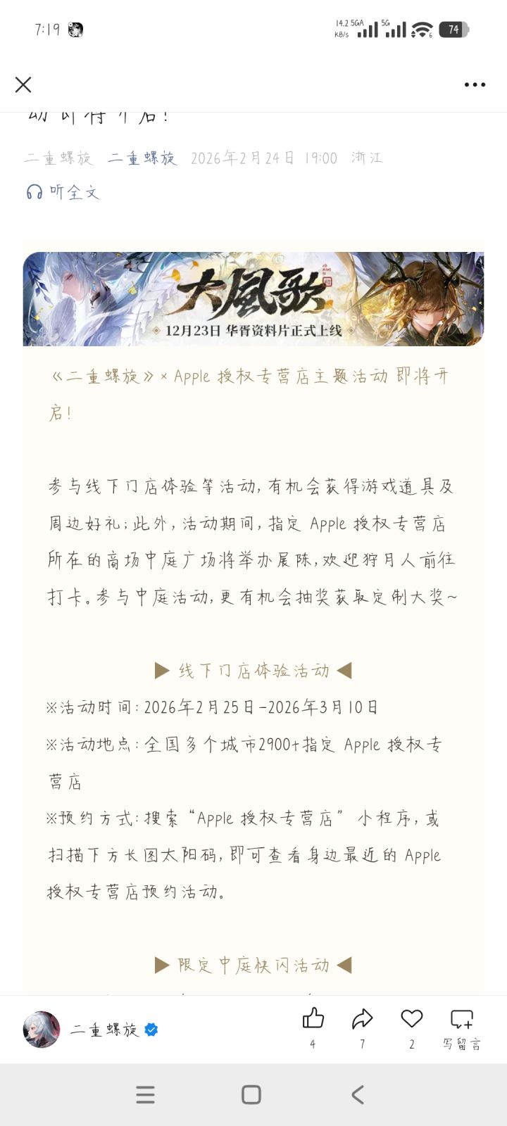 参与线下门店体验等活动,有机会获得游戏道具及周边好礼;此外,活动期间,指定 Apple 授权专营店所在的商场中庭广场将举办展陈,欢迎狩月人前往打卡。参与中庭活动,更有机会抽奖获取定制大奖~▶▶线下门店体验活动◀◀※活动时间:2026年2月25日-2026年3月10日※活动地点:全国多个城市2900+指定 Apple 授权专营店※预约方式:搜索“Apple 授权专营店” 小程序,或扫描下方长