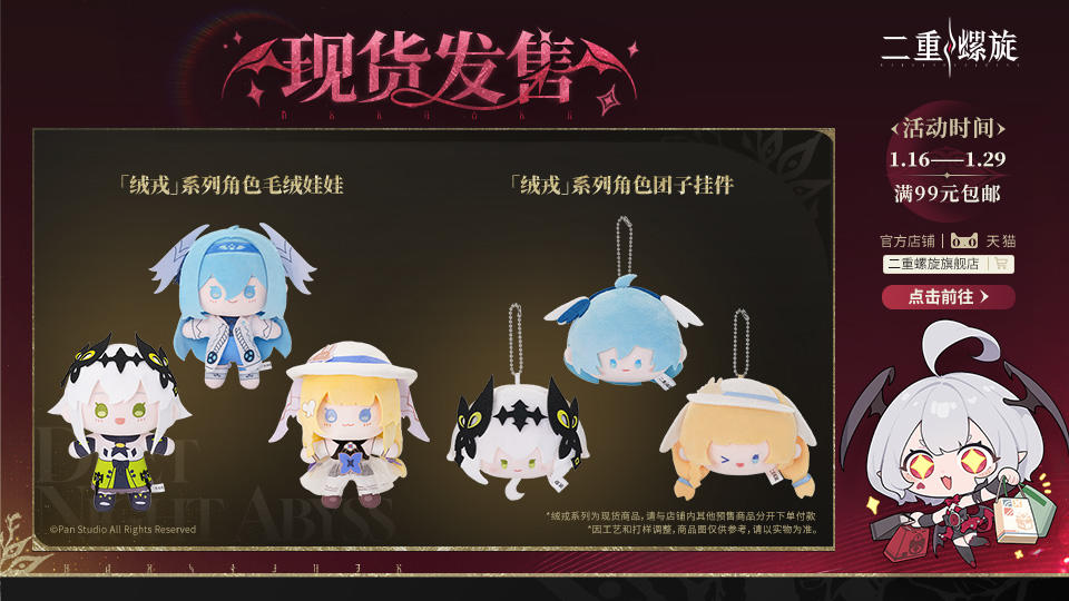 ✦ 谷皎卖场 |现货发售 |1月16日18:00上架✦上架商品✦「绒戎」系列角色毛绒娃娃(赛琪、菲娜、松露与榛子)「绒戎」系列角色团子挂件(赛琪、菲娜、松露与榛子)✦购买渠道✦【天猫】二重螺旋旗舰店【线下】名创优品部分门店(详情请点击)✦天猫限时活动✦满99元包邮✦天猫活动时间✦2026年1月16日 18:00 - 2026年1月29日 23:59