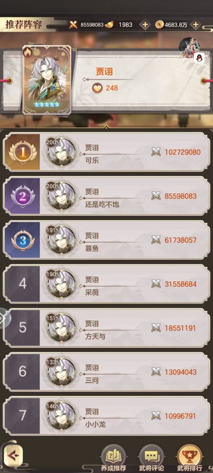 这里建议大家第一个名将换甲鱼,拥有非常高的毒伤,不管是PVP还是PVE都很舒服,高额的毒伤以及输出让他在各种环境下都可以如鱼得水,有很多大佬都玩甲鱼(如图)