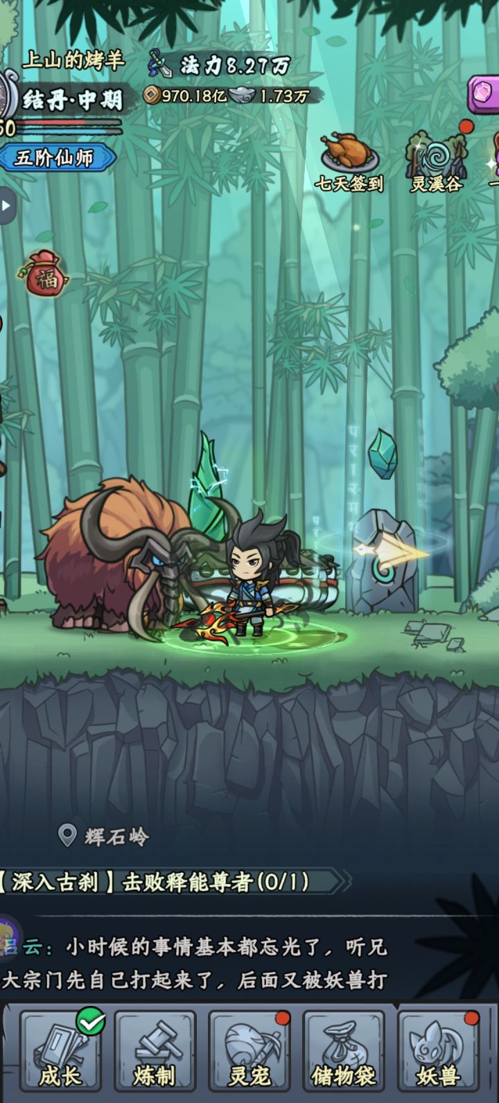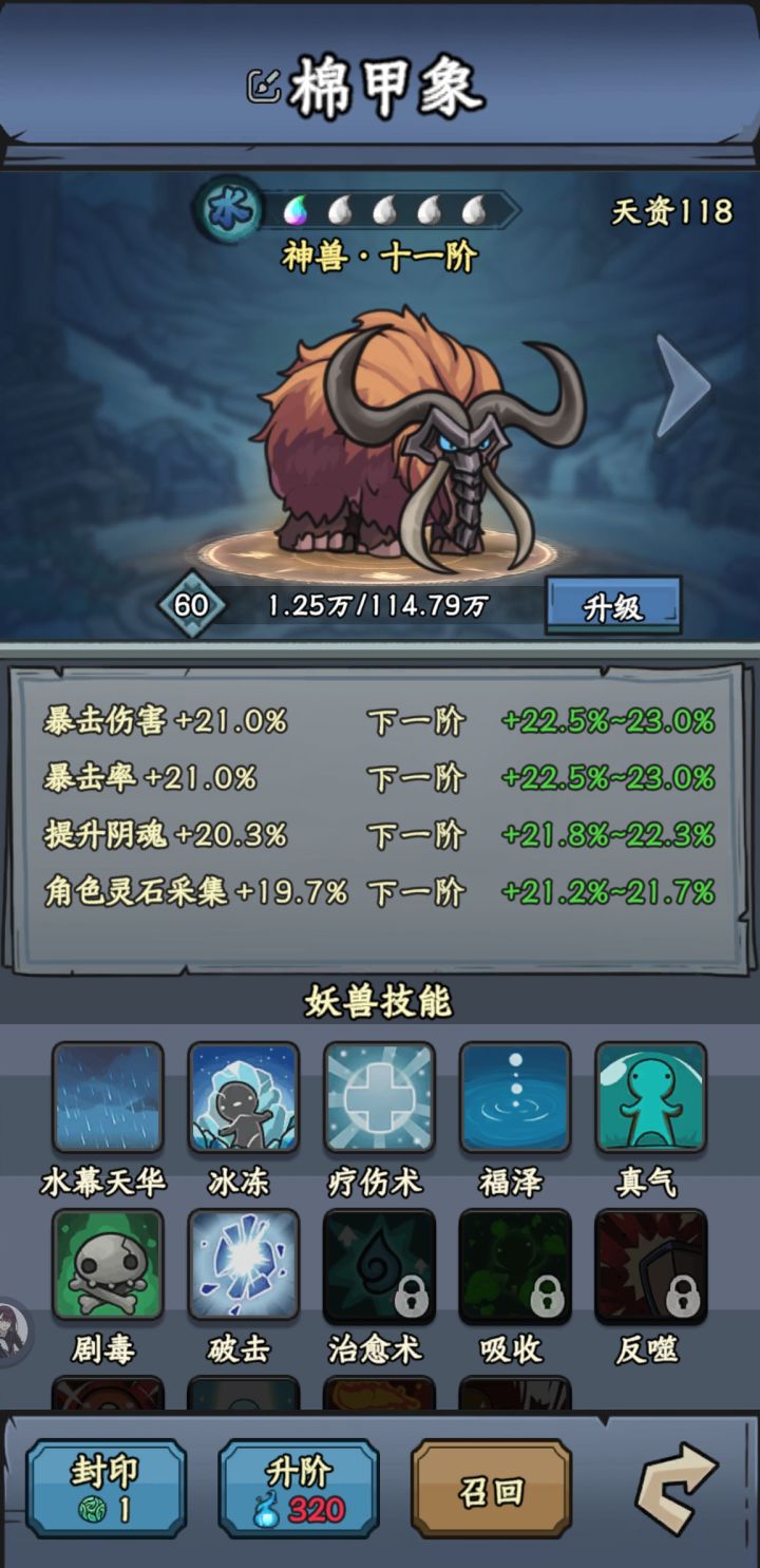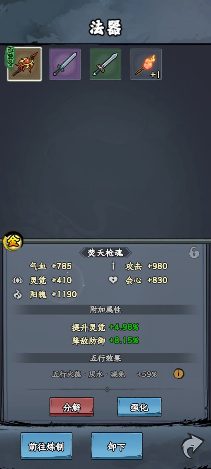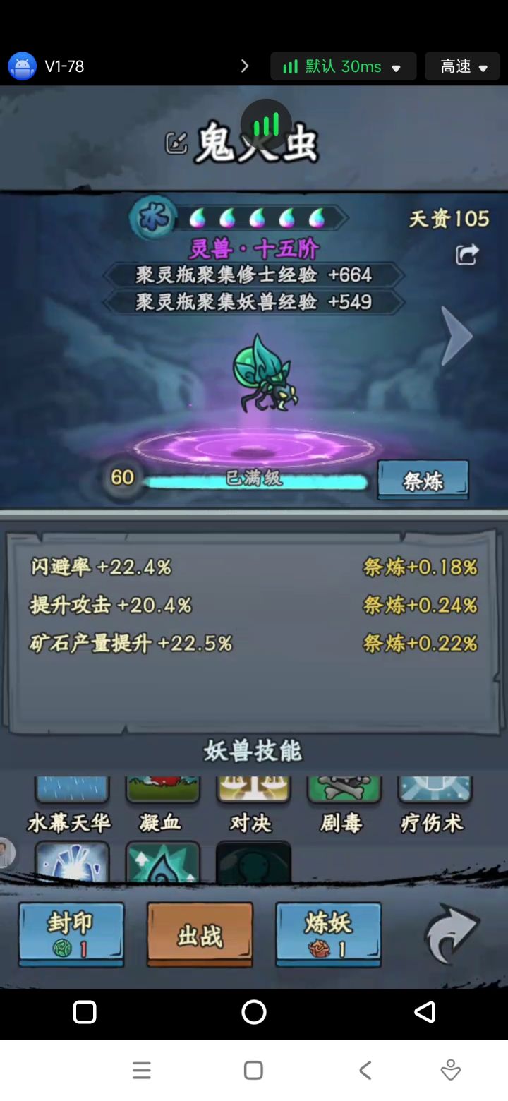 别老是听大家说的做炎套。做炎套节奏太慢了而且还没啥萌新完全没有这么多图纸和材料做装备。我是玩暴击吸血眩晕闪避全修(前期暴击吸血,后期加个闪避和眩晕)目前要不是等级不够卡元婴中期主线应该都可以通关了但是目前也只需要两件金色装备就行,打老秃驴的时候没截图,但是是六点八万战力过的,释能是八到九万战力过的套装不是最重要的,目前游戏难度其实并不高,一件金色装备远不如一件词条好的紫色装备好如果实在卡住,炼