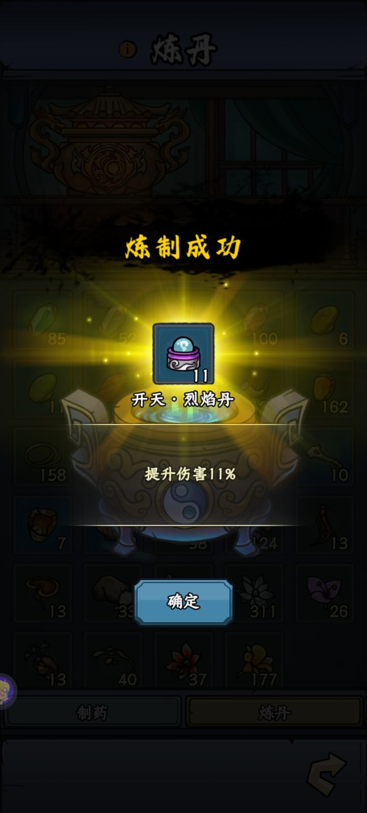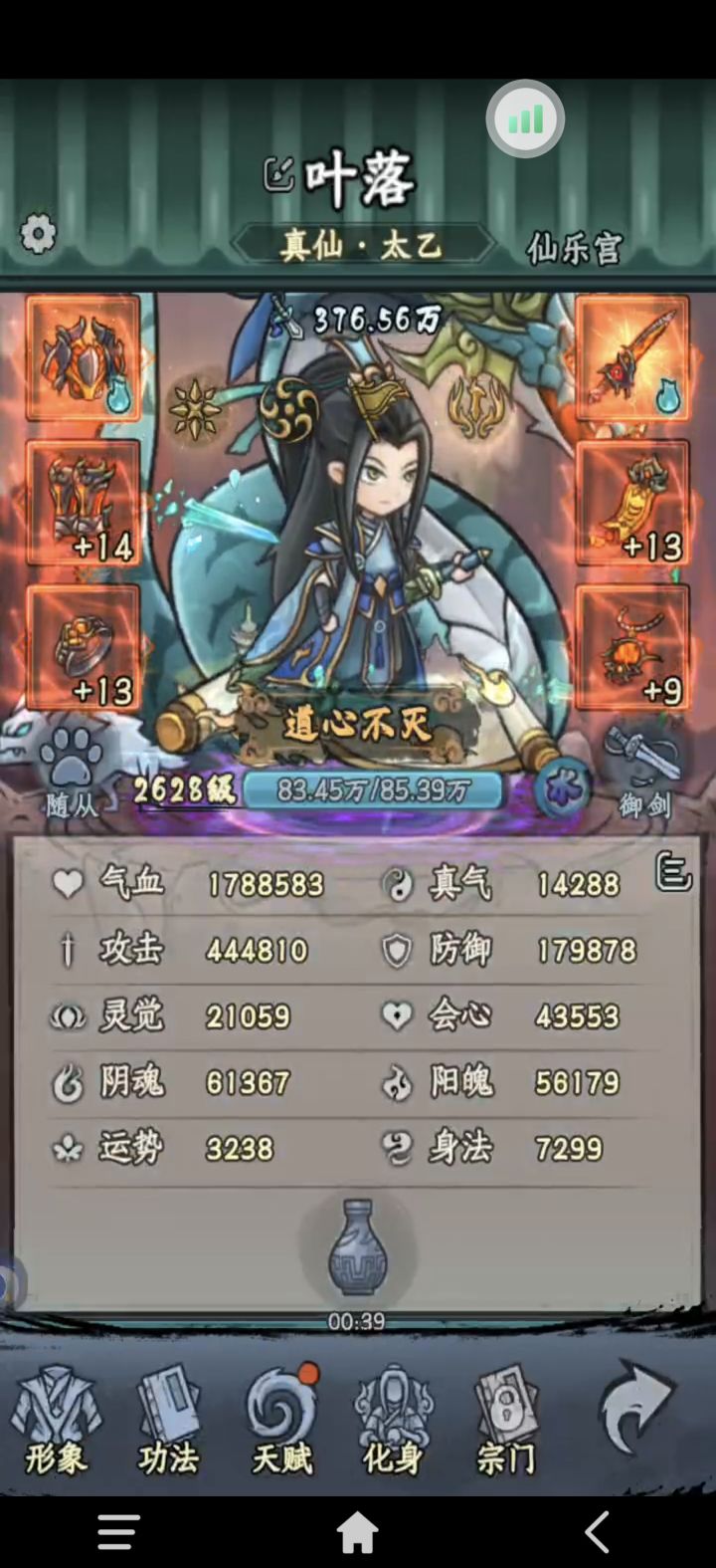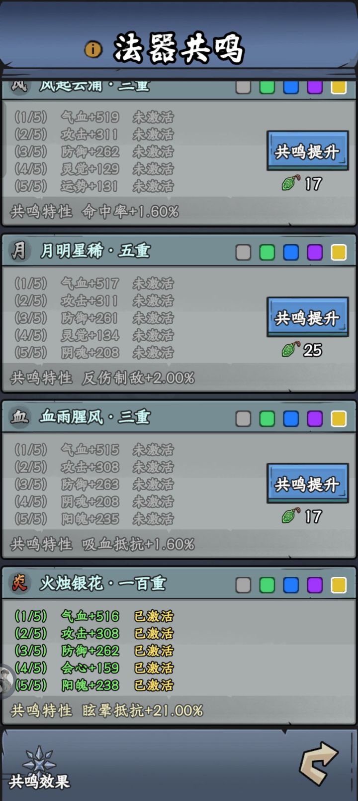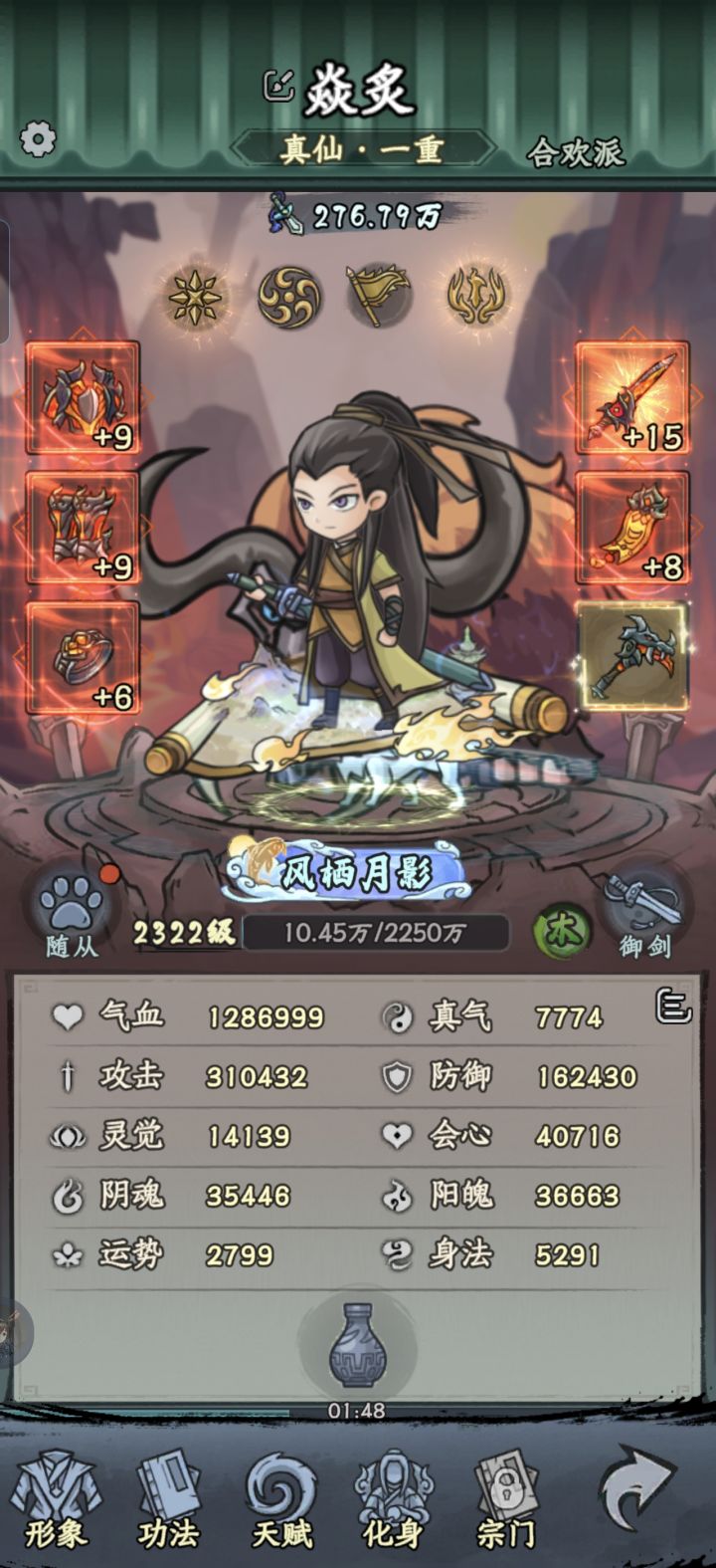 别老是听大家说的做炎套。做炎套节奏太慢了而且还没啥萌新完全没有这么多图纸和材料做装备。我是玩暴击吸血眩晕闪避全修(前期暴击吸血,后期加个闪避和眩晕)目前要不是等级不够卡元婴中期主线应该都可以通关了但是目前也只需要两件金色装备就行,打老秃驴的时候没截图,但是是六点八万战力过的,释能是八到九万战力过的套装不是最重要的,目前游戏难度其实并不高,一件金色装备远不如一件词条好的紫色装备好如果实在卡住,炼