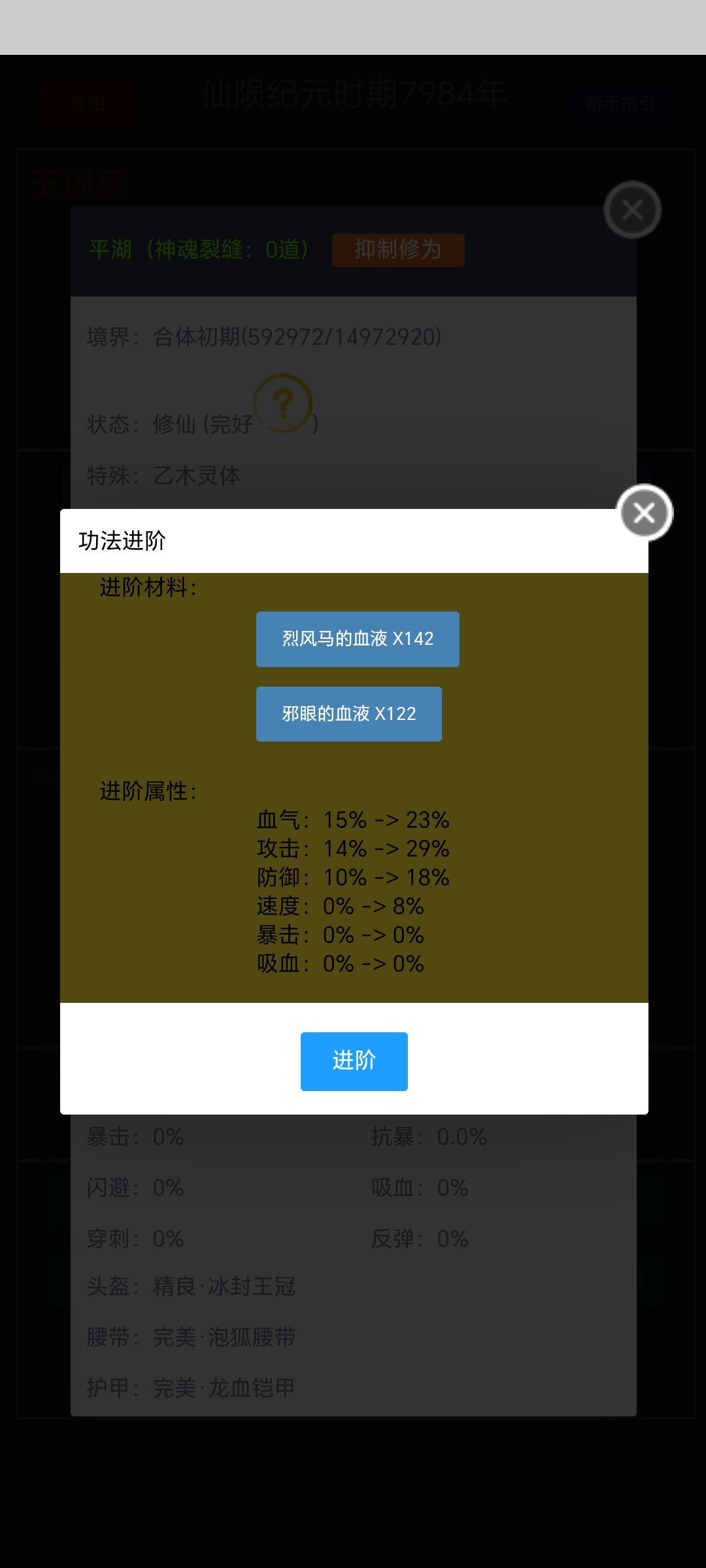 功法层数:6层 修炼境界:筑基巅峰 巅峰境界:炼虚巅峰 创造人:愚人 第一层 血气:6% 攻击:3% 防御:15% 速度:4% 暴击:0% 吸血:0% 材料:暴尘兽的血液 X105 风鸟的血液 X132 第二层 血气:6% 攻击:14 防御:23% 速度:10% 暴击:0% 吸血:0% 材料:金刚狼的血液 X107 绿眼狼的血液 X147 银背苍猿的血液 X156 第三层(碧海1.3攻击) 血气: