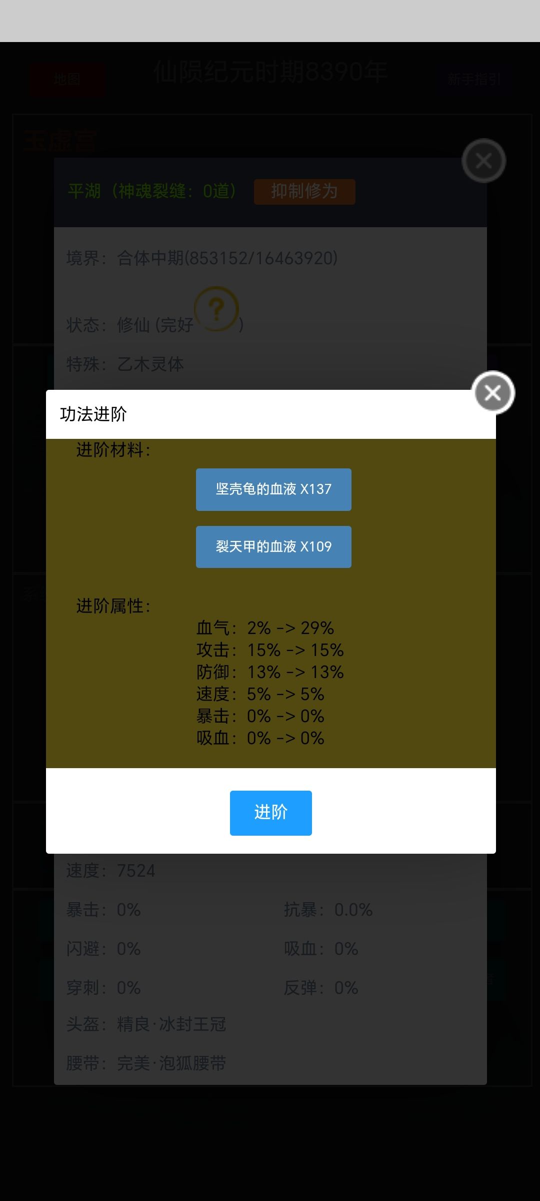 修炼境界:练气圆满 巅峰境界:炼虚后期 一技能:怒海狂涛 1.42攻 二技能:暂时不知道(五层要螳螂血,打不过,见下图)