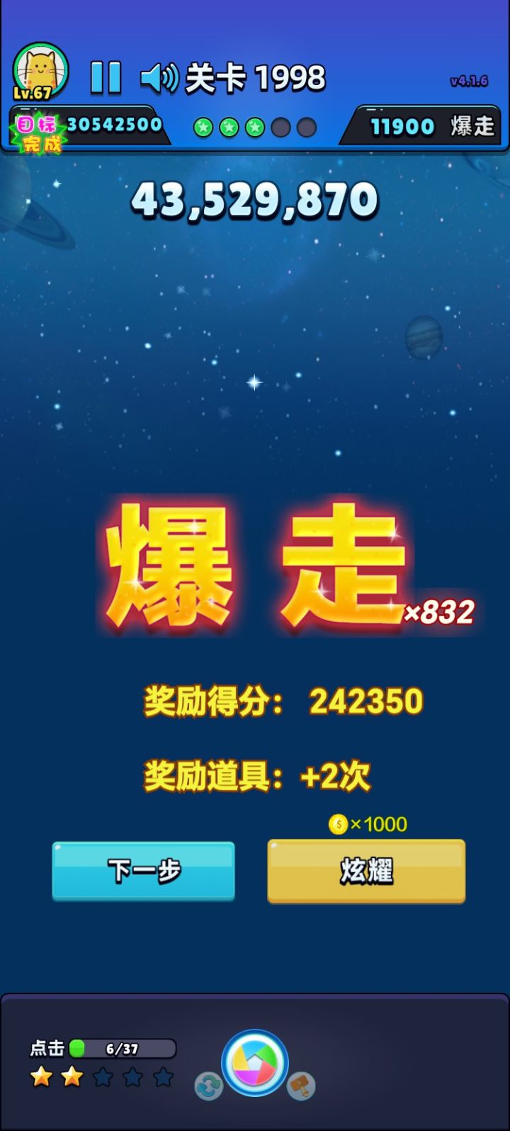 #单机游戏 #游戏推荐 我消除了所有星星,完成第17次爆走了!!!获得3750分奖励!