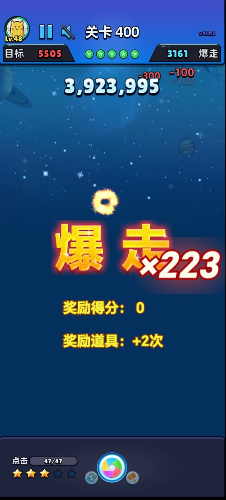 新纪录!!!获得历史最高3927375分,突破到了第400关。一共完成了223次爆走!!!最高爆走得分19360。最高单次得分:19360。共消除了 24478 个星星。共使用了 503 次技能。共获得了 1780 次称赞。#单机游戏 #游戏推荐