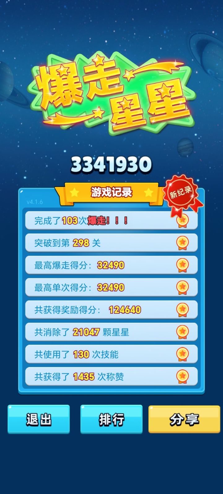 新纪录!!!获得历史最高3341930分,突破到了第298关。一共完成了103次爆走!!!最高爆走得分32490。最高单次得分:32490。共消除了 21047 个星星。共使用了 130 次技能。共获得了 1435 次称赞。#单机游戏 #游戏推荐