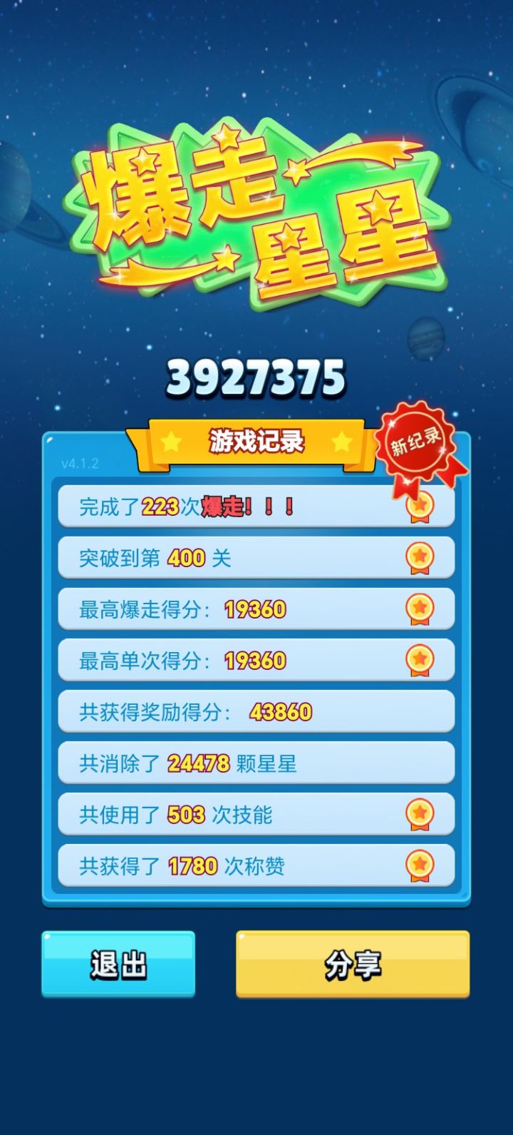 新纪录!!!获得历史最高3927375分,突破到了第400关。一共完成了223次爆走!!!最高爆走得分19360。最高单次得分:19360。共消除了 24478 个星星。共使用了 503 次技能。共获得了 1780 次称赞。#单机游戏 #游戏推荐