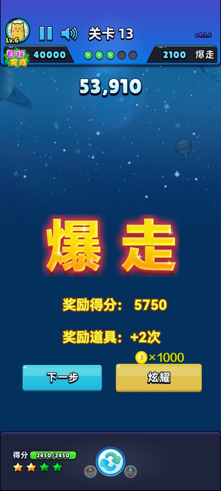 我消除了所有星星,完成第1次爆走了!!!获得5750分奖励!#单机游戏 #游戏推荐