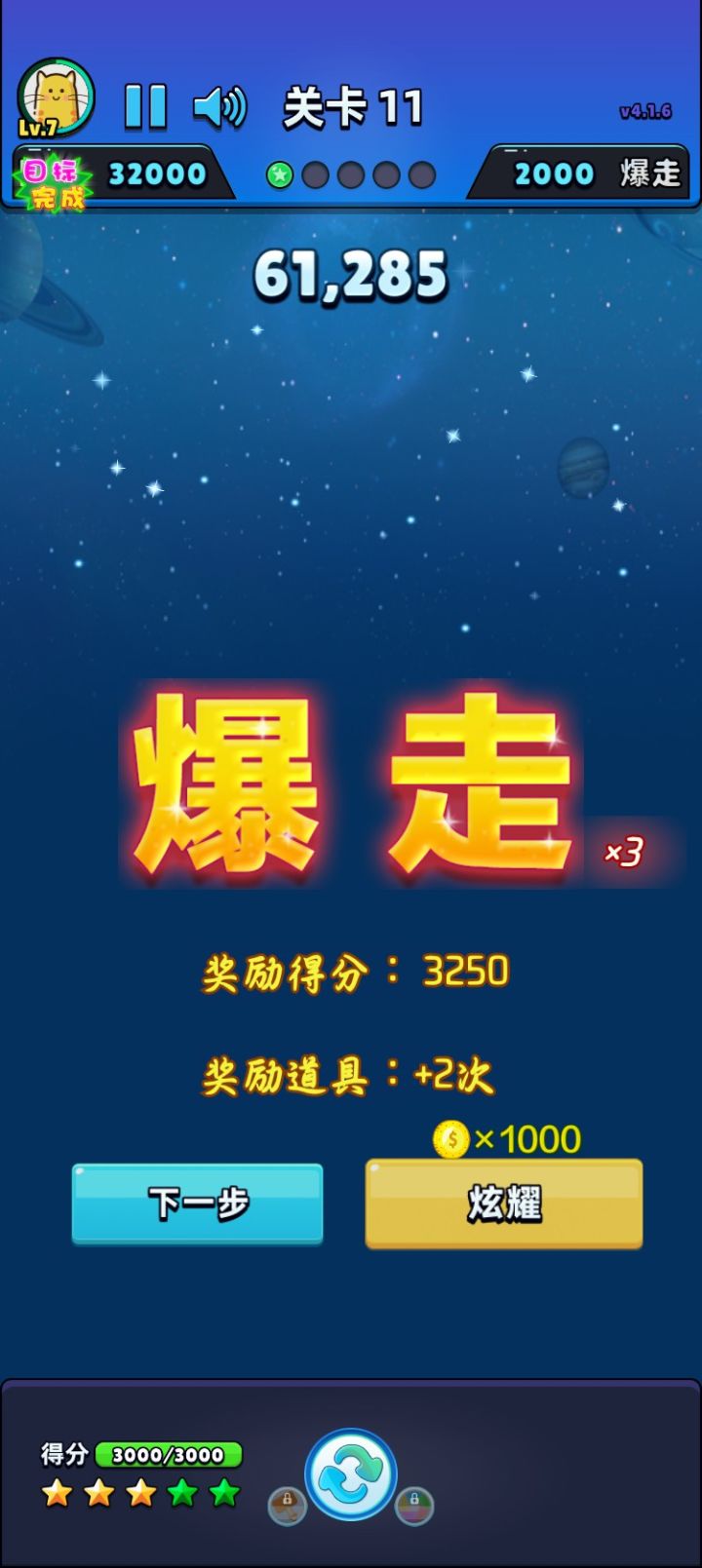 我消除了所有星星,完成第3次爆走了!!!获得3250分奖励!#单机游戏 #游戏推荐