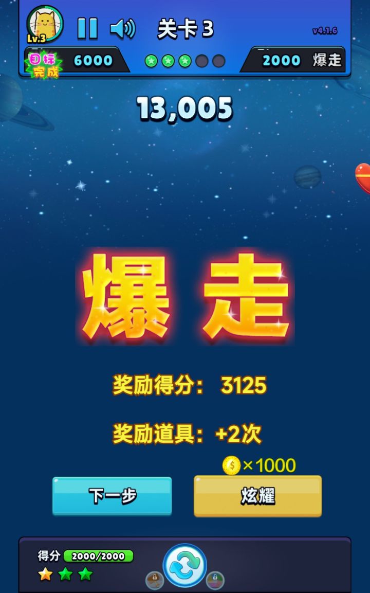 我消除了所有星星,完成第1次爆走了!!!获得3125分奖励!#单机游戏 #游戏推荐 #单机游戏 #游戏推荐