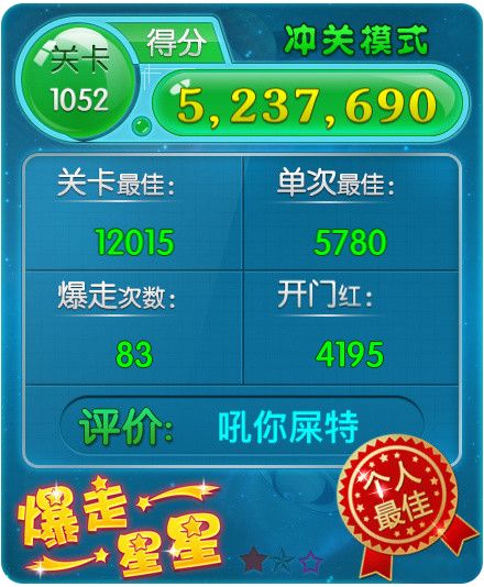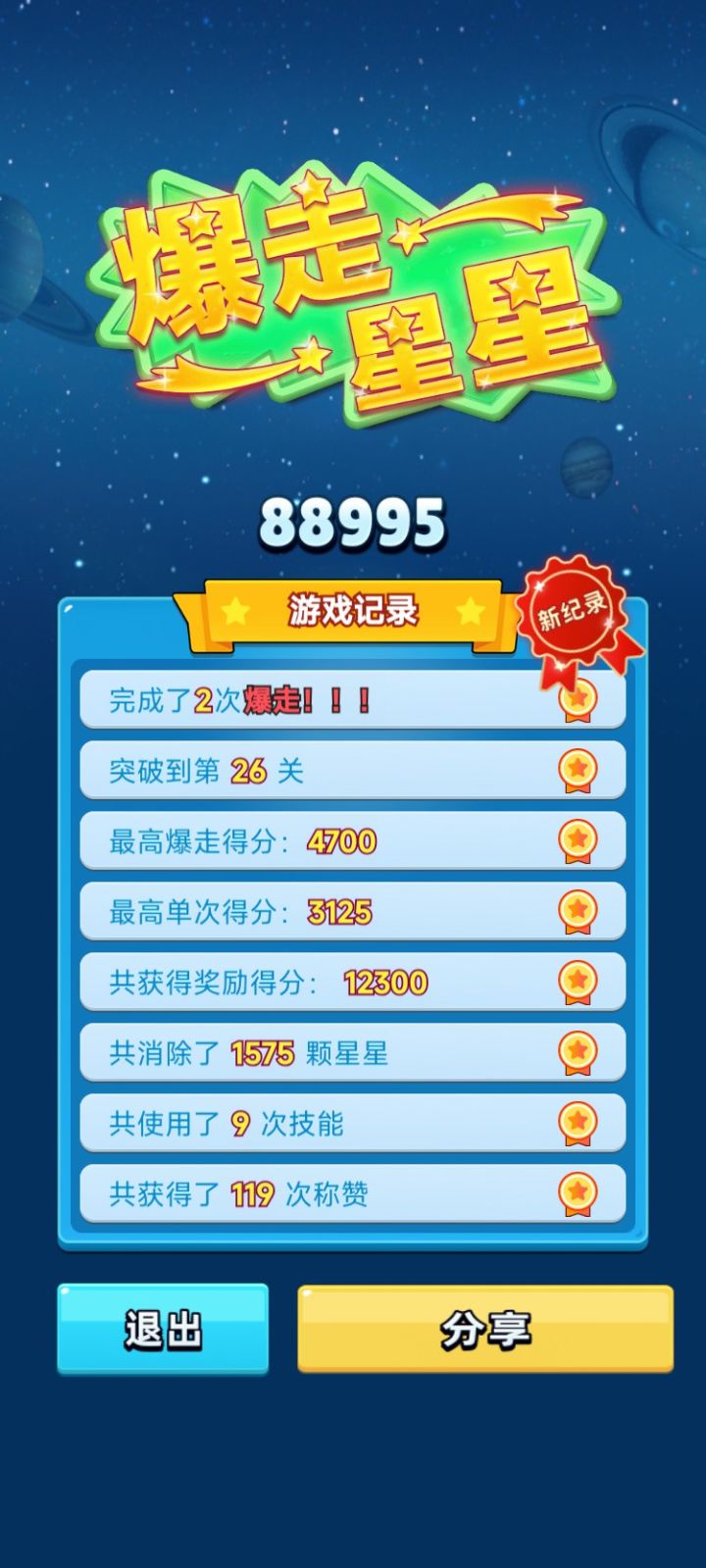 新纪录!!!获得历史最高88995分,突破到了第26关。一共完成了2次爆走!!!最高爆走得分4700。最高单次得分:3125。共消除了 1575 个星星。共使用了 9 次技能。共获得了 119 次称赞。#单机游戏 #游戏推荐