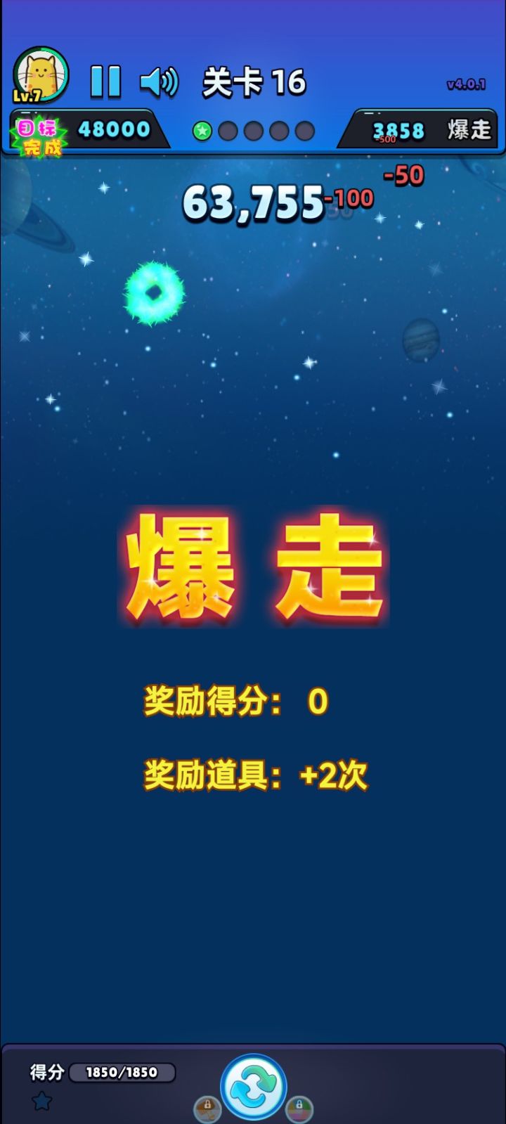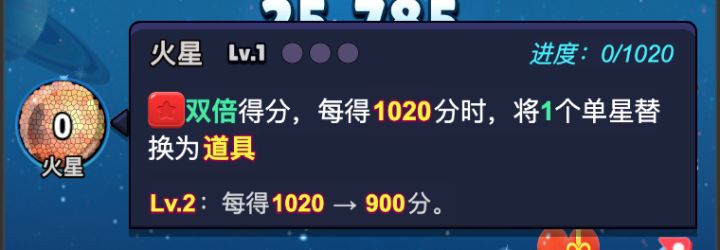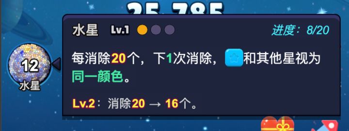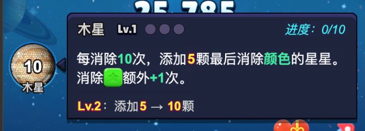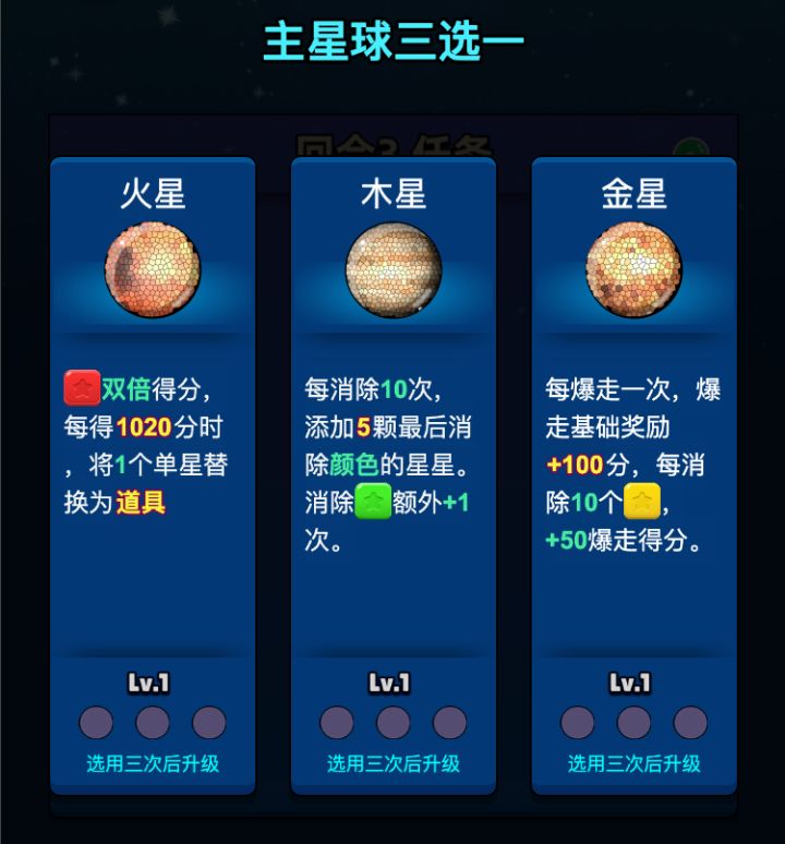 1、新增星球功能,现在有五个星球;2、第二回合开始可三选一星球;3、每回合第一次跳关,可额外选择一个星球;4、星球每回合会清除,多次选择可升级星球;5、调整消除时,星星数量较多的动画效果;6、调整关卡的数值;7、修复一些Bug,提高性能。#单机游戏 #游戏推荐