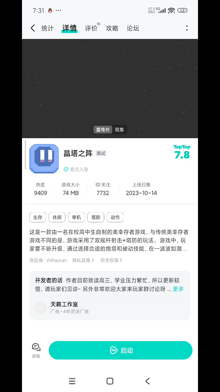 挺爽的肉鸽打怪能升级,升级可以选不同的炮塔,炮塔的一部分属性能反馈给自身,相当于变相加点,升级给的炮塔不会消失而且打够怪以后可以升级,有穿透,射程,散射,雷火冰,弹夹一些很爽的属性,就是游戏不稳定吧玩了一会卡退两次,还有一些被动增幅,第一次通关的就是雷属性的炮塔,相当爽散射穿透多重雷属性打击冰冻火焰。希望作者可以多开发一些关卡(附上通关视频)#新年新安利#游戏安利#游戏推荐#单机游戏