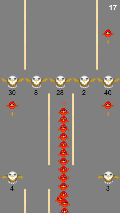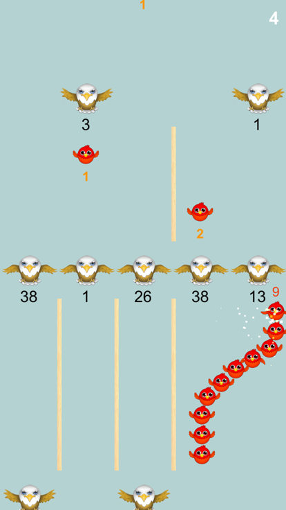 2.小心!领头碰到老鹰就会被吃掉几只小鸟,当所有小鸟都被吃掉,游戏结束。