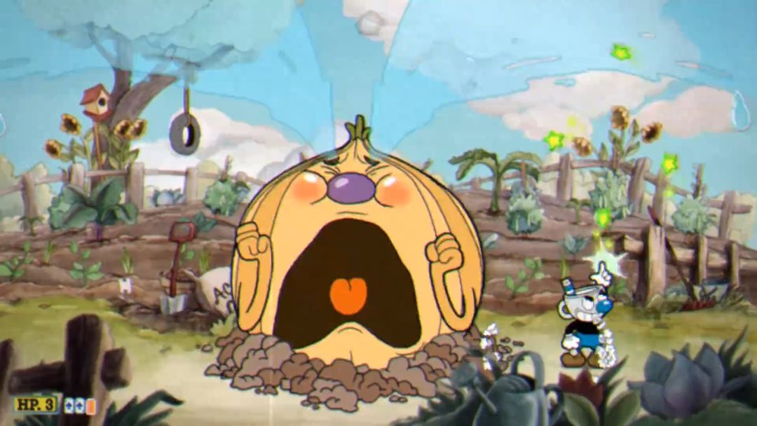 该关卡位于商店对面,在该关卡中我们需要击败【植物三人组】。 第一阶段的敌人是土豆,土豆会连续向前吐出3个泥团和1只蚯蚓。 最后的蚯蚓可以通过格挡拍击抵消。 将土豆消灭后与洋葱进行战斗,洋葱会从中间位置的地下钻出,提前向两边移动不要被洋葱碰到导致损失生命值。 洋葱在被攻击时会不停大哭,随后在眼泪中会不断落下水滴。粉色的水滴可以通过格挡拍击进行抵消。 第三阶段敌人是胡萝卜,如果在二阶段中不打洋葱,则在