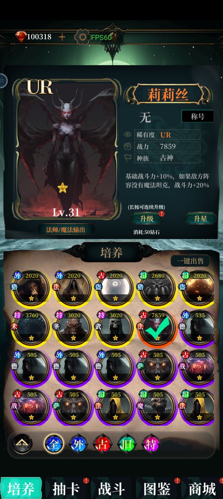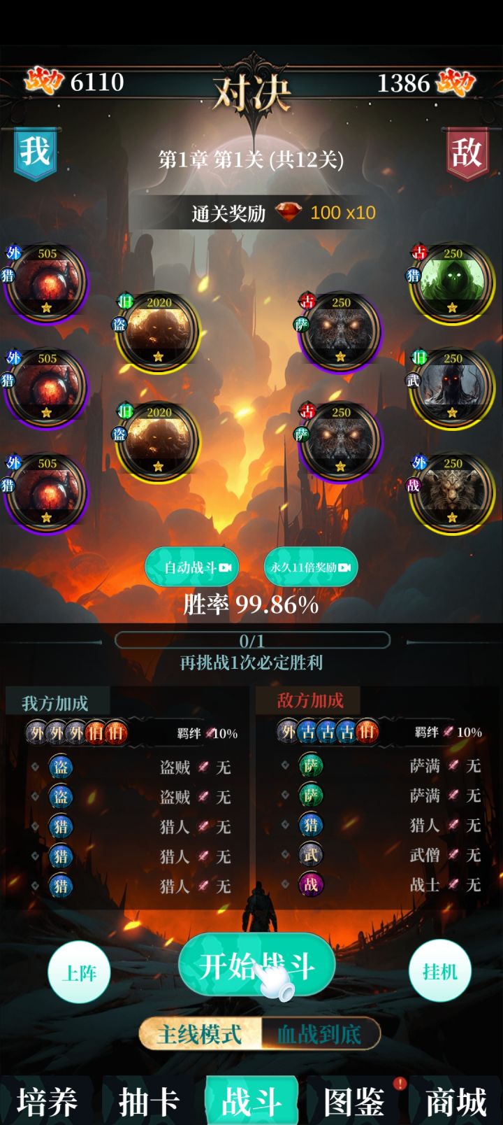 玩了半天左右,广告看了上百个,UR英雄升满了,关卡就100关,打完后打精英就发生错误了,然后就打不了了。sr以下的卡片卖不掉,随便升级一个卡片又恢复了,很影响升星体验,sr卡也没用,后面更新最好也能卖掉,关卡倍数最多20倍,100关后一局500000钻石,比看广告划算。
