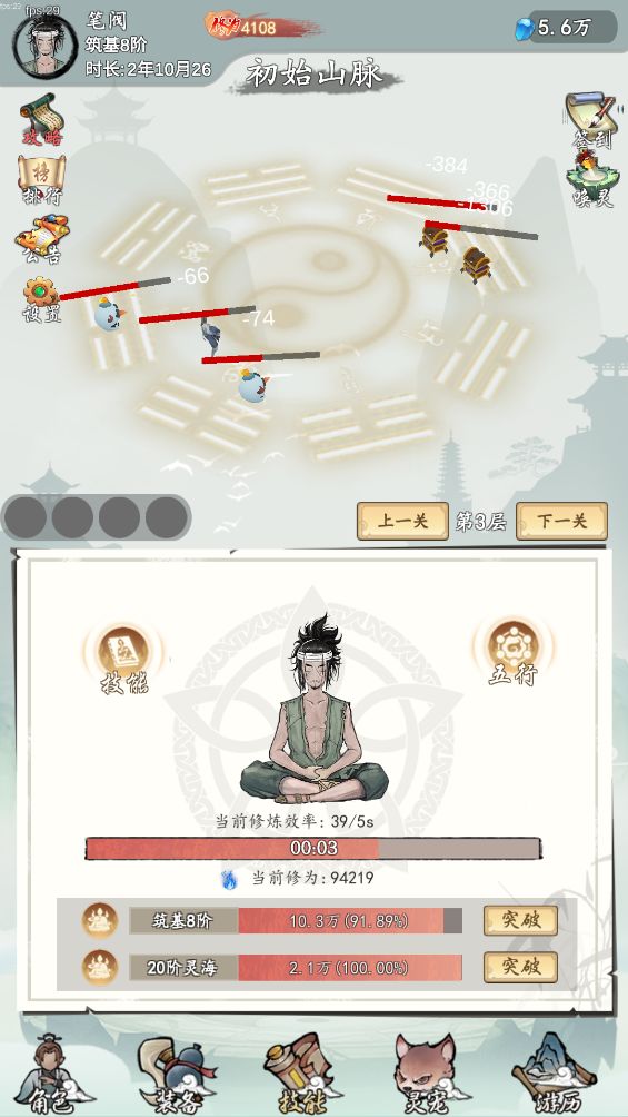在美术物料包装及玩法流程设定上,能精准拿捏到核心修仙党的预期心理:开局随机Roll人物职业及属性,放置挂机产修为提升修仙境界,简单易懂地线性闯关爬塔主线,配合多样化次级养成线:技能武学,灵宝五行,灵脉炼丹等。