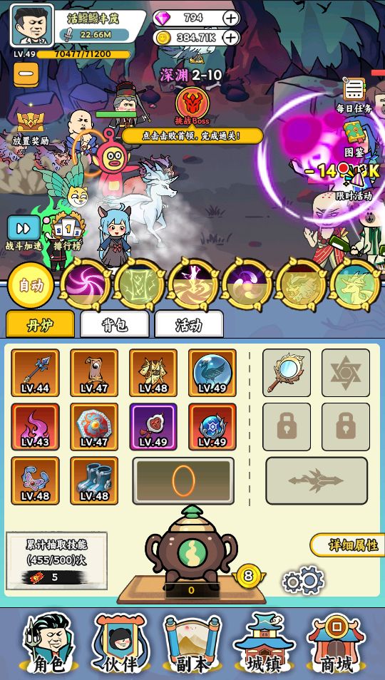 炼丹炉8级可以一次炼2颗丹药12级4颗丹药炼丹炉等级越高炼丹数量越多可以在自动炼丹界面设置。自动炼丹装备系统自定义比你现有的装备评分高才会停止,这样就没办法得到你想要的装备属性只能随机属性,目前只有一个办法得到想要的属性只能手动炼丹。有些萌新不知道圣物在那里使用,这个就在装备右边第一个格子。还有关掉技能特效开关可以让游戏更省电流畅手机不易发烫。