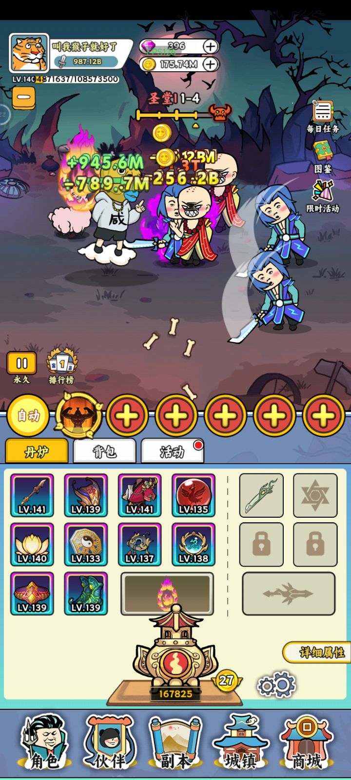 后期技能是没啥大用的还卡,靠图鉴的普攻和连击输出,炉子选暴击连击,没有丹的话先搞套暴击,圣物的话中间3个和我一样就行,其他都不是很重要。猫神的话一个全局一个BOSS伤剩下的可以都是爆伤,也可以多搞个全局,BOSS伤的话最好不要太多打小怪都麻烦。还有就是可以的话加我龙哥公会1194237。记得每天签到,还有就是新的一年大家都要开开心心的啊