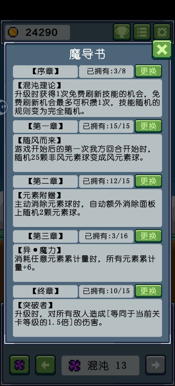 等到通关了所有诅咒之后,就拿到了我最喜欢的魔导书章节【贪婪者】,太好使了。至此我的魔导书就固定下来了。不过后来为了攒金币,把元素附赠改成加金币的那个了,聊胜于无。用惯了贪婪者,最后搞装备散财者通关的那个成就的时候换了【散财者】就不大顺手了,玩这个得搭配【异•利剑】才好使。
