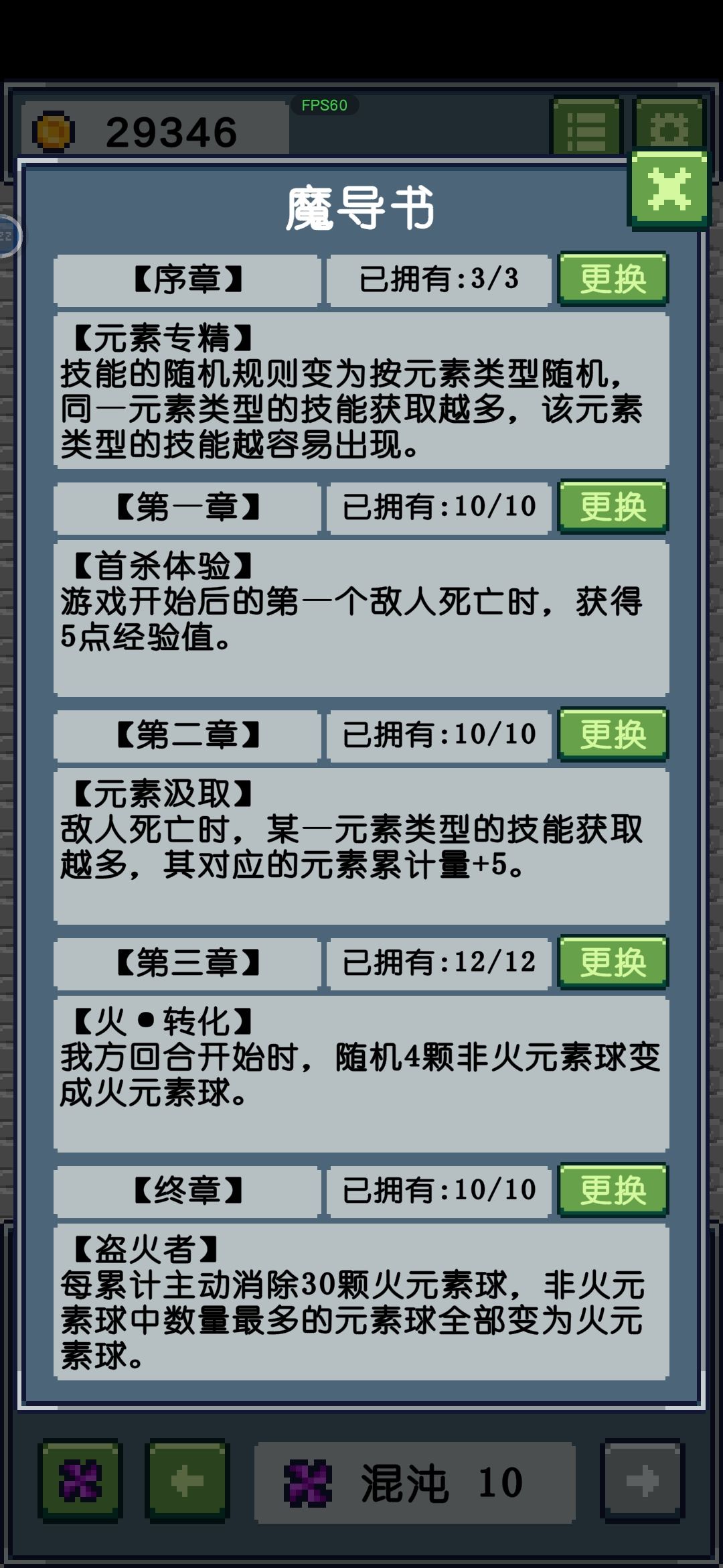 其他元素早就通关了,只打卡火元素是因为我感觉火元素前期发育过渡比其他元素难,我这是试了好几次才通关的,前期火元素特别难触发魔导书的5技能,经常都是几颗几颗在消除,导致伤害不足直接被突脸。 这随机3敌人5伤害补伤害在前期很有用,直接提供15点有效伤害,不知道还有没其他比较好的选择,不然要roll这个技能还是有点麻烦的 顺带这个【水灵之泪】和【凝火体质】完全没触发过,只要伤害够高,进攻就是最好的防守