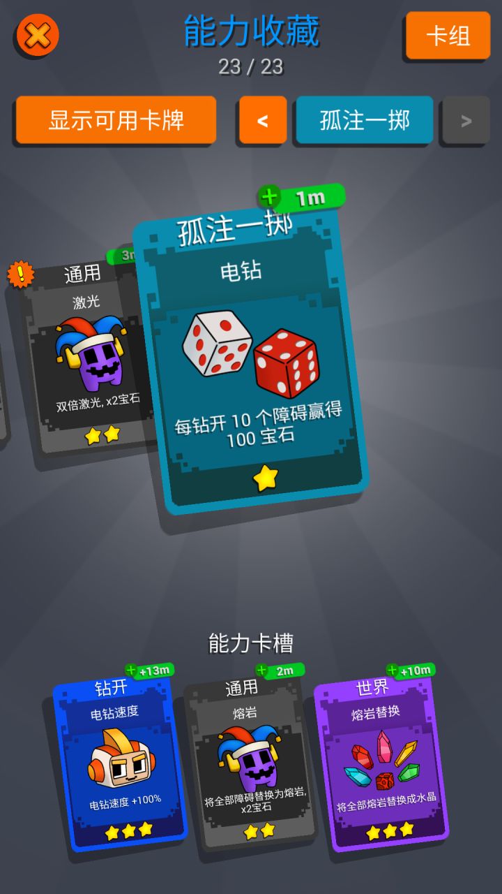 我玩了半小时,把三个机器人全部升满级了,花了75金币买了随机牌组,这套牌组刷宝石刷金币賊溜。牌组核心在于宝石多倍,正常玩的时候有概率看广告获得10分钟的双倍宝石时间,加上这套牌组,每次死于熔岩获得1500+宝石.50+金币,刷了几遍就没得玩了,卡牌多了无法叠加,合成,丢弃这是个坑爹的事情,周末优惠要求不带能力玩30分钟。