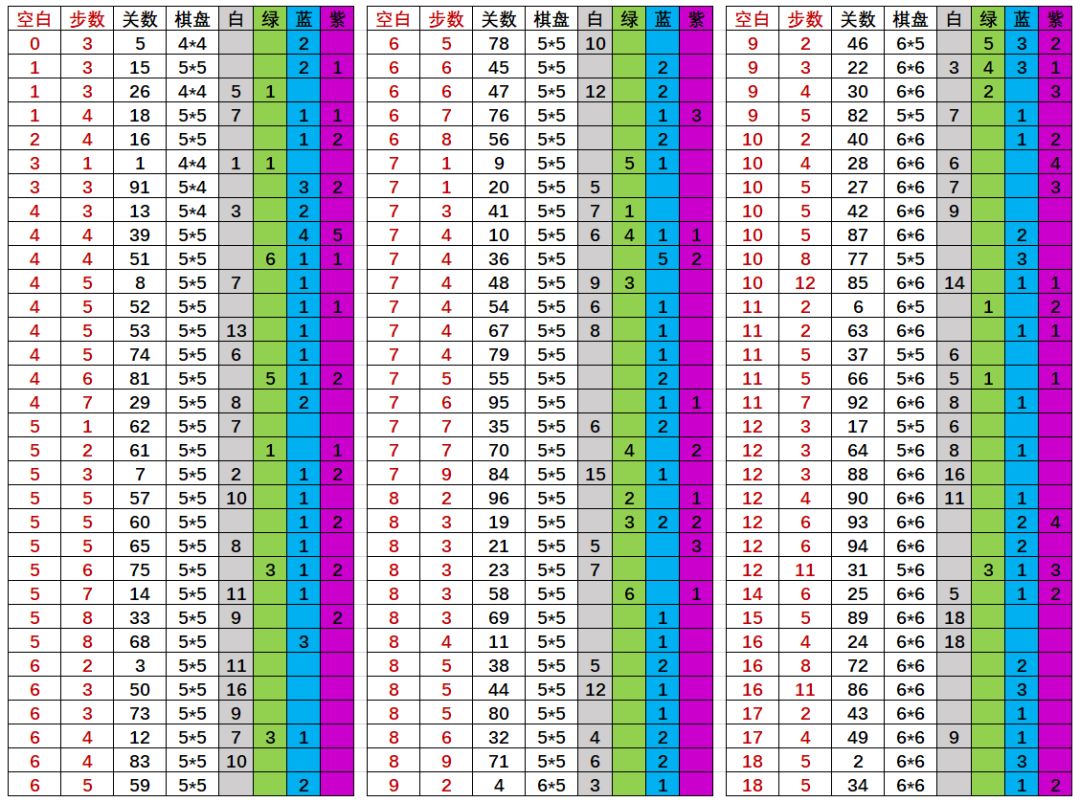 最近更新后出的随机解谜真是让很多人抓狂,所以我根据自己的理解制作了这个表格,可以快速定位到关卡数。 关于表的说明 1、棋盘的大小是按照最大值计算的,比如第二关是6*6,而不是5*5。 2、空白是指棋盘里没有怪物的空白格数量(如第二关为18),步数为解谜的初始行动步数(如第二关为5),白绿蓝紫表示胜利条件需要各颜色的数量(如第二关为3蓝)。 3、使用方法:根据空白和步数基本能确定大概位置,然后根据白