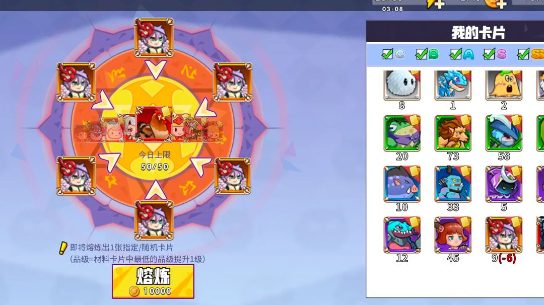 这游戏最快日常做法,秘境全随缘,只打人机局(建议打开手机boost模式,加载速度快,阵容必须带上有猫猫拳的世界猫,可以秒杀世界boss) 中午11~下午2点上线 1、进入秘境,合成25步 2、家园切换血量装一键探索、商店购买6次装备,魔法塔合成卡片、主界面熔炼50张红卡。 3、扫荡藏宝图初级~终极 4、夺矿战争夺三次 5、消除王进去无脑拖最上端(隔天领紫蛋) 6、魔王五刀(可按排刀表六刀) 7、悬