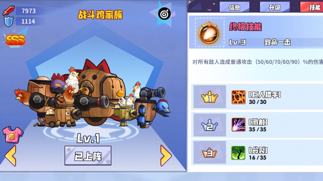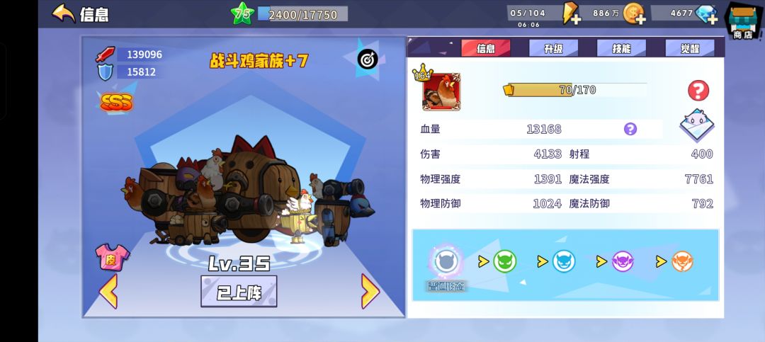 我也是小萌新一枚,拿着战斗鸡一路横推到74关第一次卡关。然后仔细一看怪物属性,才发现好多怪物的防御都要2500+,对于萌新的战斗鸡来说几乎无法破防。 那就只能靠近战反弹来打伤害了,但是高防御的岛数量太多,沙盘格子数量又少,每回合一个橙色锤子不现实。 所以想到了以下通关策略, 1.点出天赋的3级汲血之杖(拖出家族+15等级)前,只拖出一个紫色鸡撑战力 2.汲血之杖3级后,将所有传说家族置换为战斗鸡拖