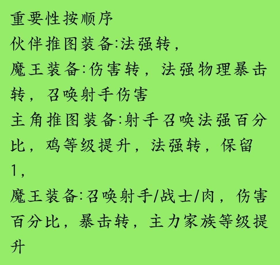 1.依旧每天熔炼50战斗鸡,鸡等级30以上再考虑熔其他红卡。 2.提升酒馆等级,上最高品质的伙伴,开始为出战伙伴找法强转装备(如图一),其他伙伴穿血量百分比装备用于探索,伙伴最终形态为2骑士,2不动之岳加15神使。 3.升级除橙卡外的所有家族,提升角色等级,穿法强转宝物(如图二)橙卡里只升橙子,女巫,大树,牛魔和地龙,其他用于熔炼。 4.尽可能去推关,越往后收益越高,鸡有一千多法强就可以通过黑暗符