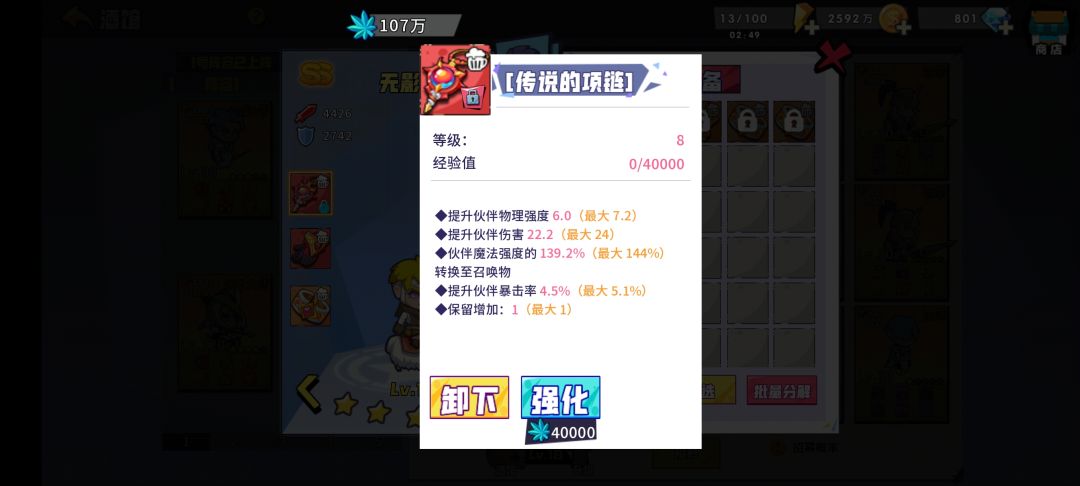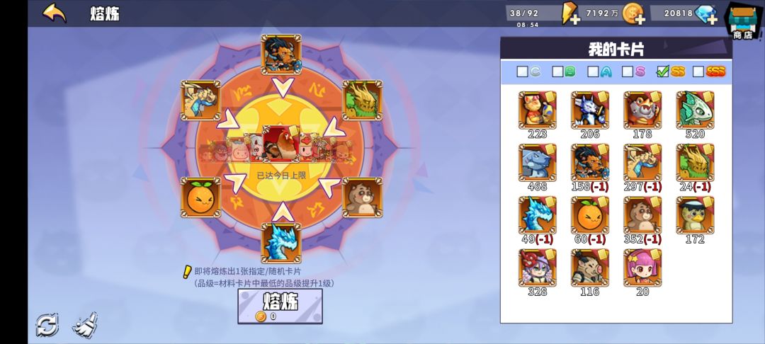 1.依旧每天熔炼50战斗鸡,鸡等级30以上再考虑熔其他红卡。 2.提升酒馆等级,上最高品质的伙伴,开始为出战伙伴找法强转装备(如图一),其他伙伴穿血量百分比装备用于探索,伙伴最终形态为2骑士,2不动之岳加15神使。 3.升级除橙卡外的所有家族,提升角色等级,穿法强转宝物(如图二)橙卡里只升橙子,女巫,大树,牛魔和地龙,其他用于熔炼。 4.尽可能去推关,越往后收益越高,鸡有一千多法强就可以通过黑暗符