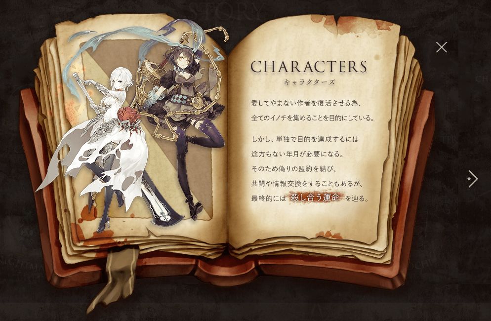 CHARACTERS (人物) 为了复活心中深爱的作者, 目标是汇集所有生灵。 只是,单打独斗必耗无尽的岁月。 因此,虚伪盟约应运而成, 过程中各位共同战斗,分享情报, 最终,却仍逃不过互相残杀的命运。 以后会优先在情报推微博上投稿发布情报,请戳微博地址 TAP、贴吧、扣扣群以后都会比微博晚1~2天左右发布