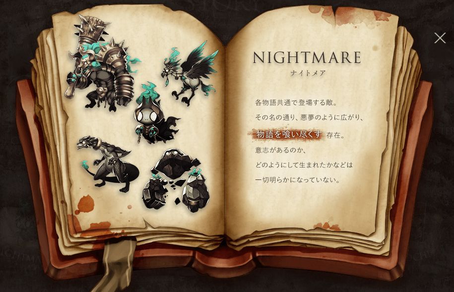 NIGHTMARE (噩梦) 各物语中共同登场的敌人。 正如其名,他们如噩梦般不断蔓延。 一个将要食尽物语的存在。 是否持有意志,又是从何而来? 一切仍是个迷。 以后会优先在情报推微博上投稿发布情报,请戳微博地址 TAP、贴吧、扣扣群以后都会比微博晚1~2天左右发布