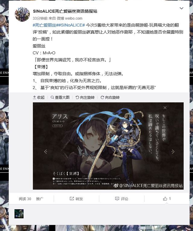 爱丽丝 CV:M•A•O 左下【束缚】 增加限制,夺取自由。或指捆绑身体,无法动弹。 1、 自我束缚的她,化身为无言之刃。 2、 基于“良知”的行动不受外界规矩限制,这就是所谓的“无善无恶”。 右上 即便世界充满诅咒,我亦不轻言放弃。 以后会优先在情报推微博上投稿发布情报,请戳微博地址 TAP、贴吧、扣扣群以后都会比微博晚1~2天左右发布