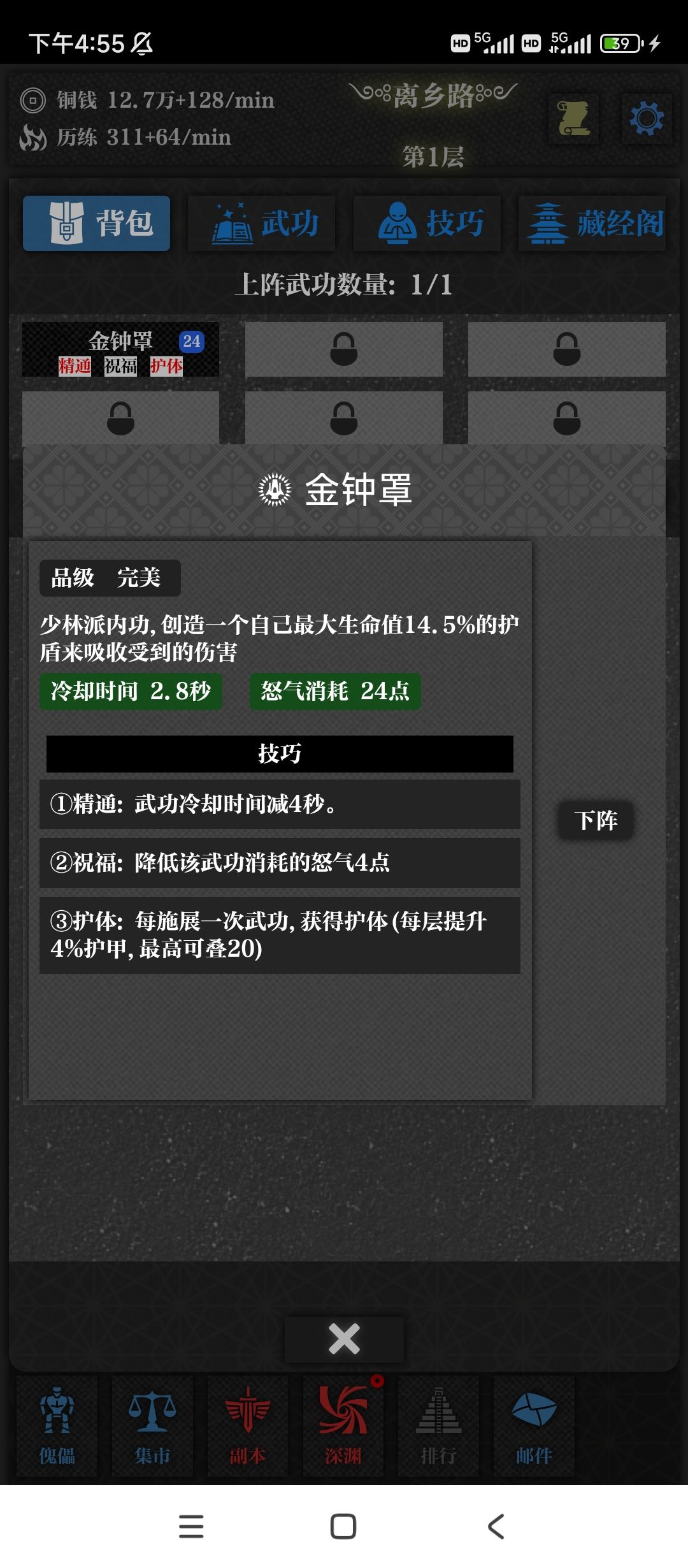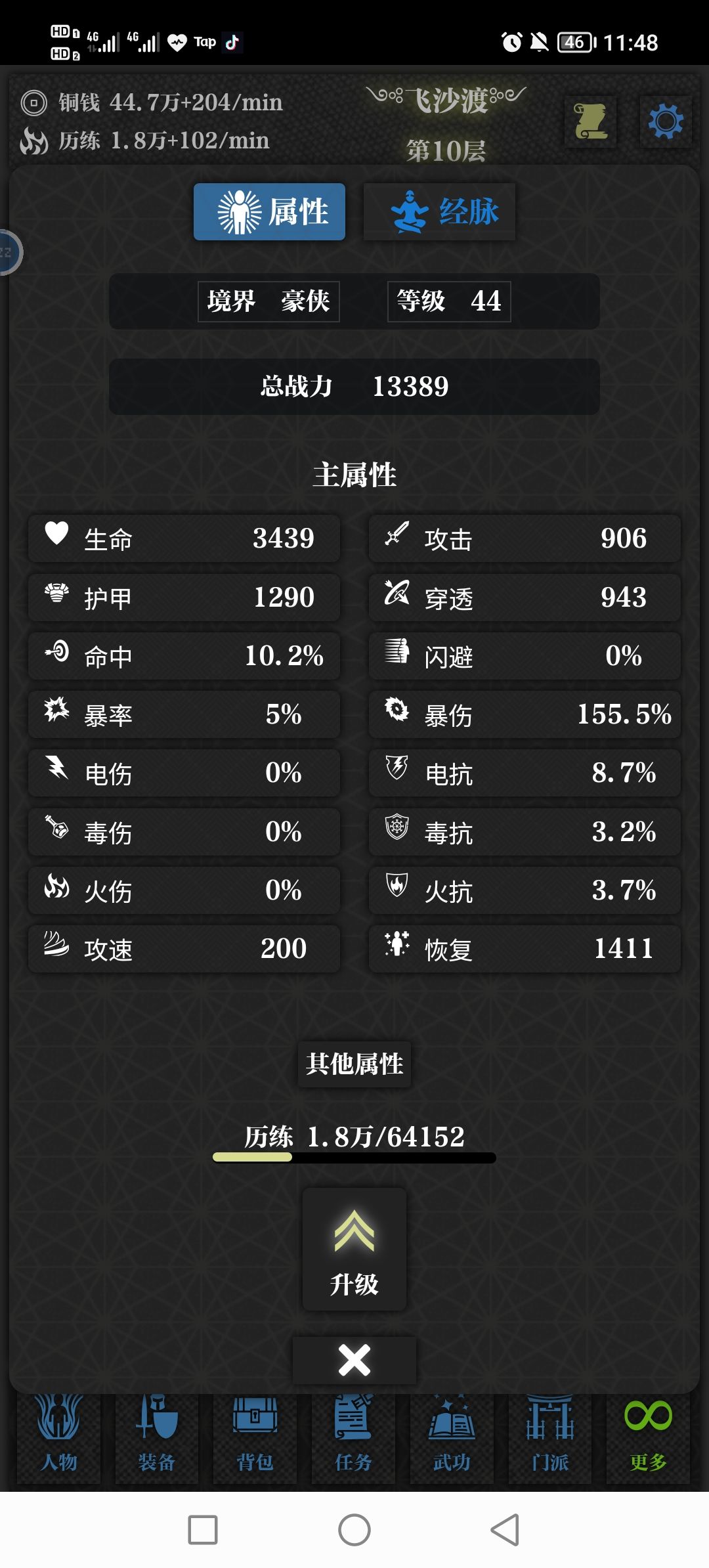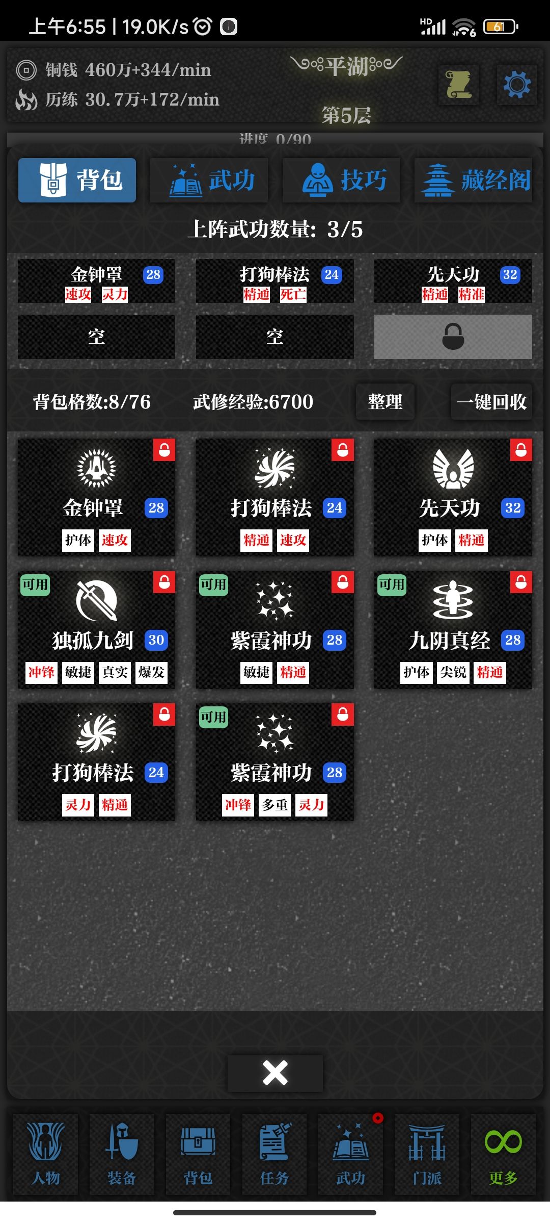 如题,我晚开一天的号,进度突然把开的早一天的两个号进度超了_(:з」∠)_ 昨天晚上从飞沙渡1打到飞沙渡10的时候我还没反应过来……好家伙回过神后直接垂死病中惊坐起ԅ(¯ㅂ¯ԅ) 对照了一下前两个号:那两个号人物属性傀儡属性都比这个高,装备和这个一样都是两红两黄3级。 根据控制变量法,恩,那必然是武功的错! 下面是今天的截图,昨天还是43级,武功的独孤九剑是没词条的,打狗棒法是个蓝色的单速攻,不过