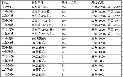 俗话说:“不想当将军的厨子不是好士兵”,在魔域大陆上,不想当王爷的玩家同样也是一名合格的士兵。 作为一名征战在魔域大陆上的神选者,想要登上王位走上人生巅峰迎娶白富美收获“万人敬仰”,首先就要搞明白《魔域手游》中的爵位系统。要成为金字塔顶端的人 在《魔域手游》中爵位是玩家们战力加成的一大来源之一,通过挑战恶魔塔,玩家可以受封爵位从而获得与该爵位匹配的战斗力加成。爵位共分为16级,每个服